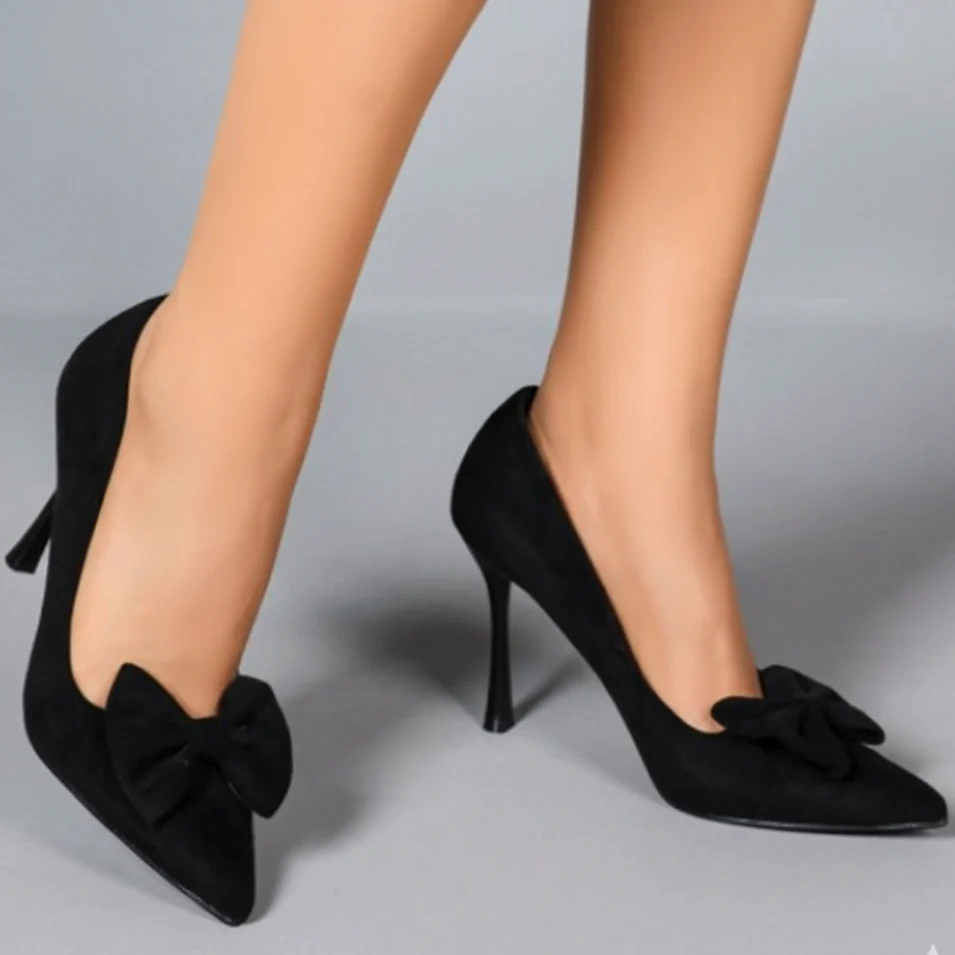 Motif/Détail : Nœud décoratif sur le devant Largeur du pied : Étroit Type de talon : Aiguille (Stiletto) Semelle intérieure/doublure : Non visible, probablement simili cuir ou textile Matière : daim Bout de chaussure : Pointu Fermeture : Fermé / À enfiler Saison : Toute l’année Hauteur du talon : Semble être d’au moins 9-10 […]