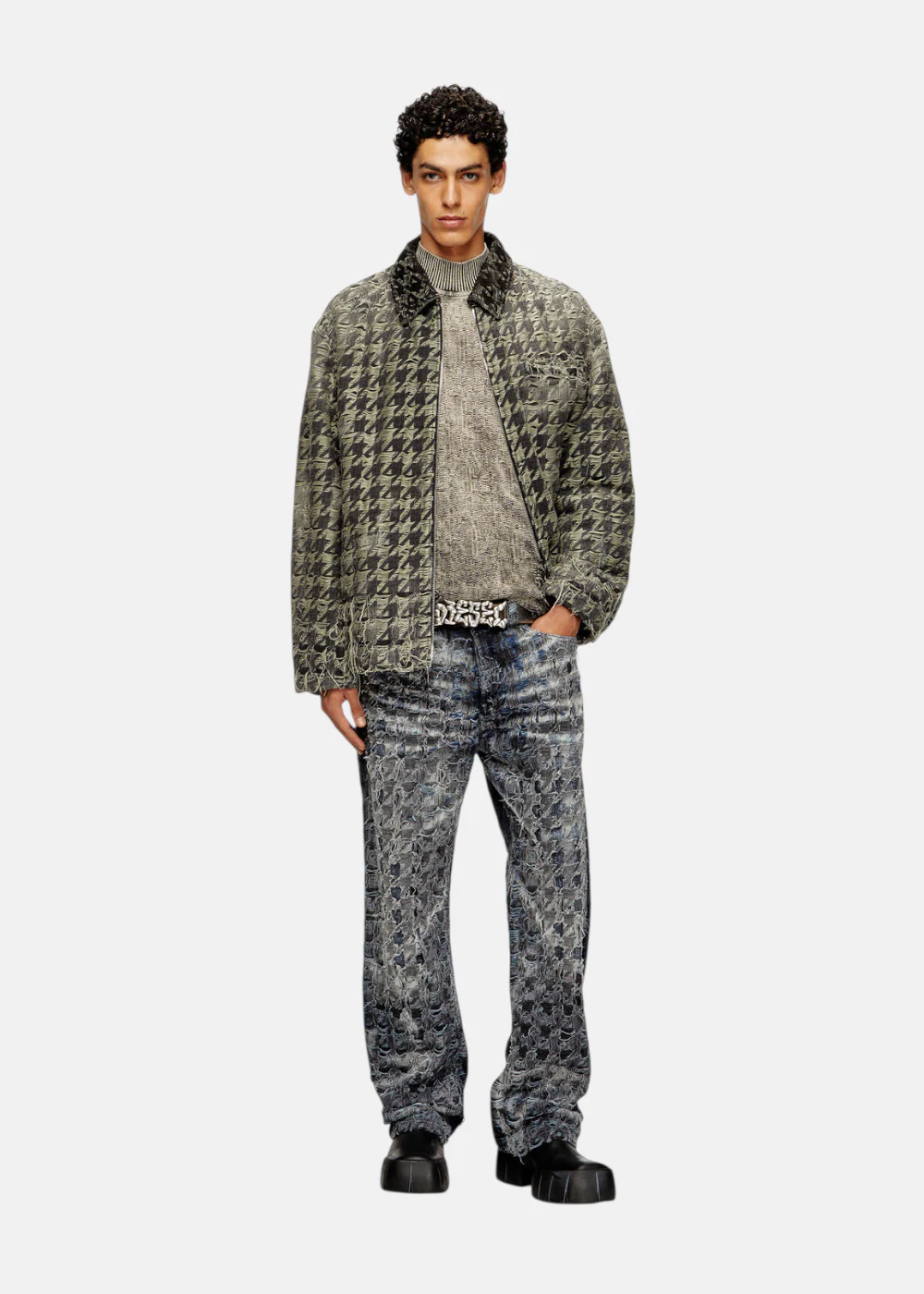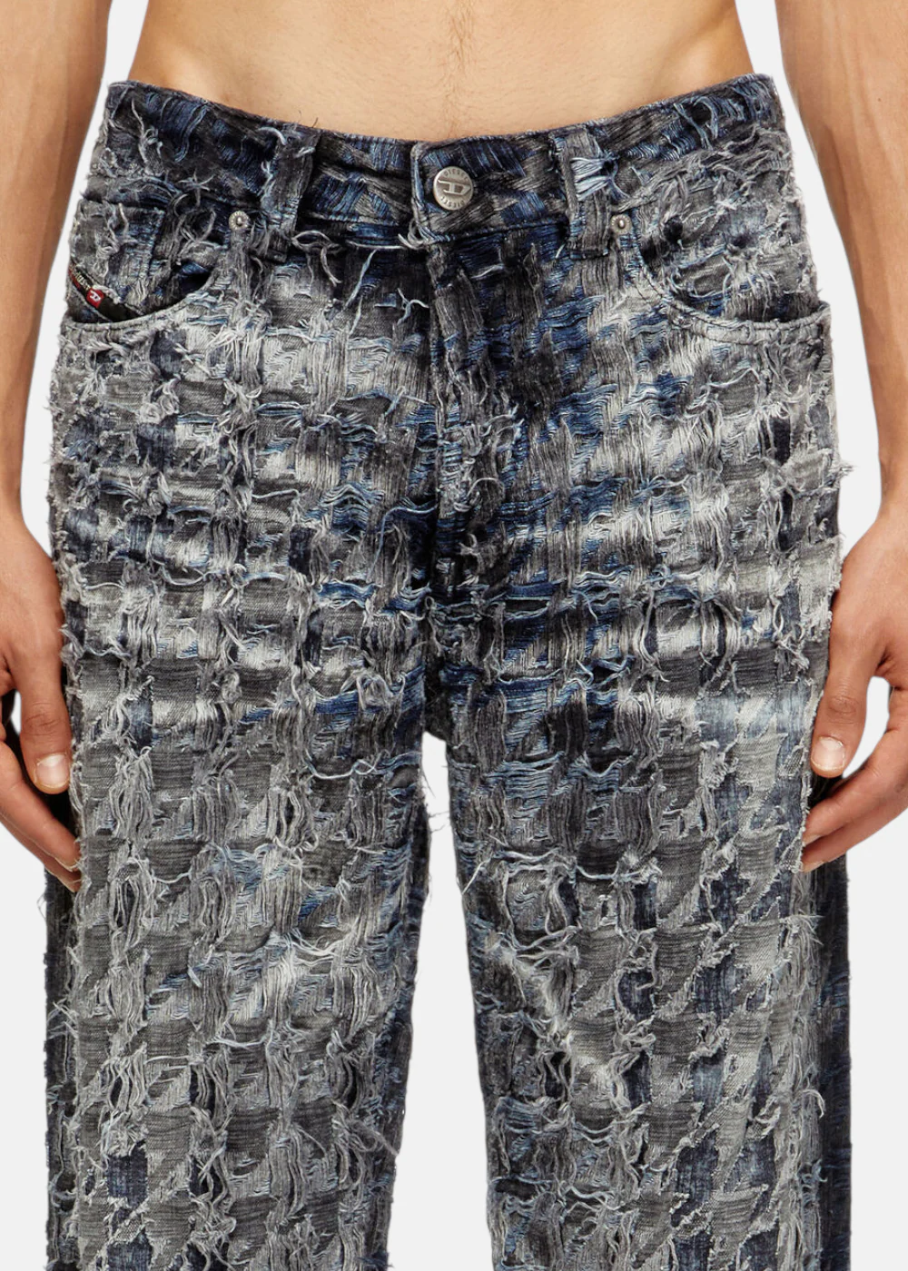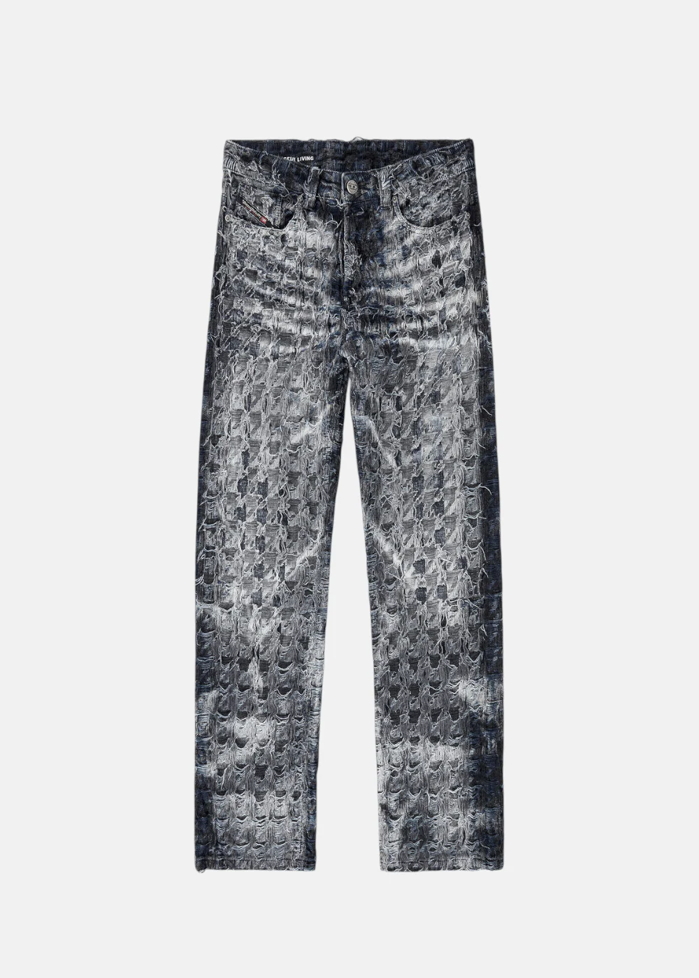 Jean Diesel homme en denim fixe non extensible, coupe décontractée, motif pied-de-poule créé par traitement tie-dye, laser et blanchiment. Pièce unique issue du Défilé Hiver 2025.