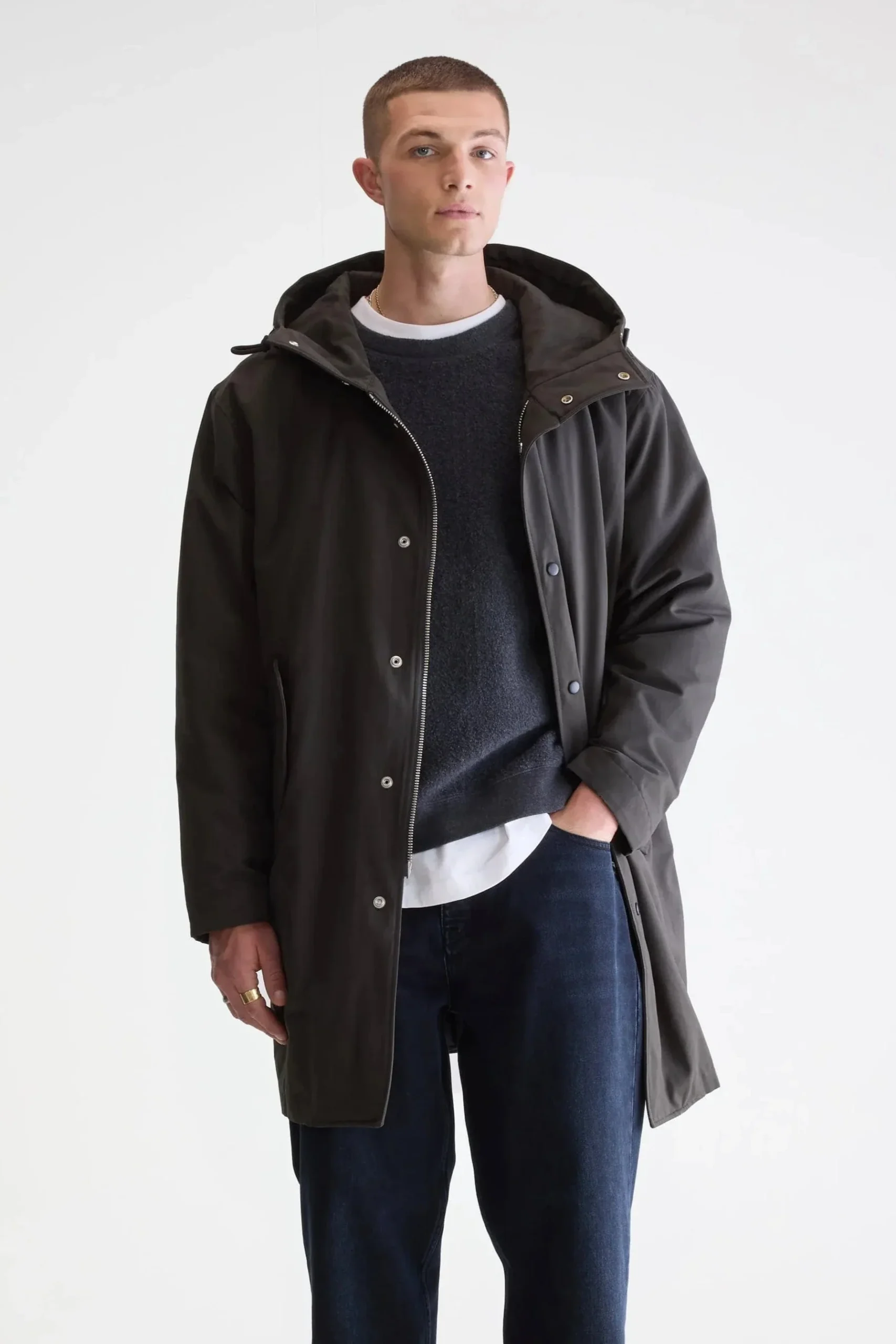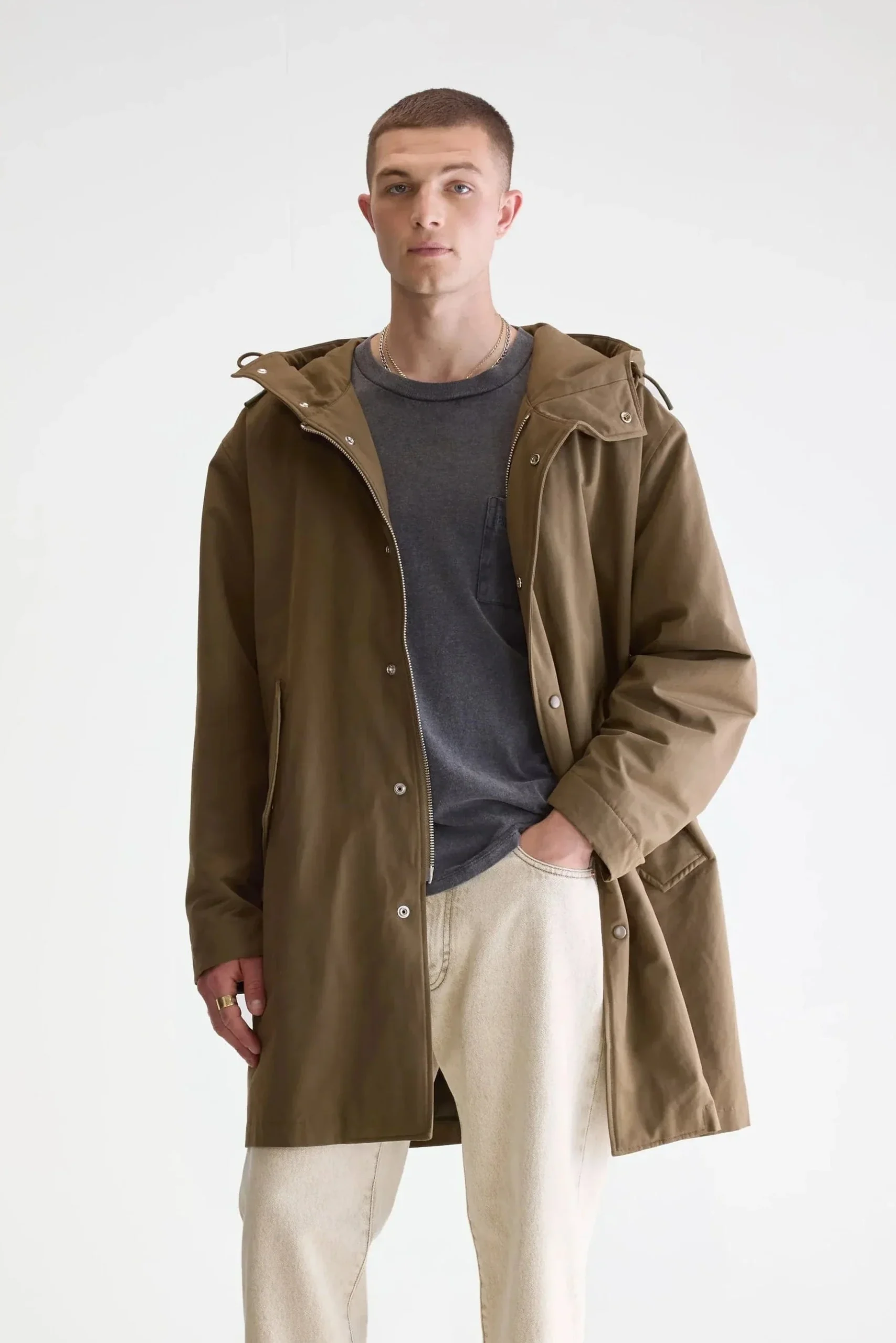 - Détails : Capuche avec col montant, fermeture zippée + boutons pression, poches à rabat, épaules tombantes.