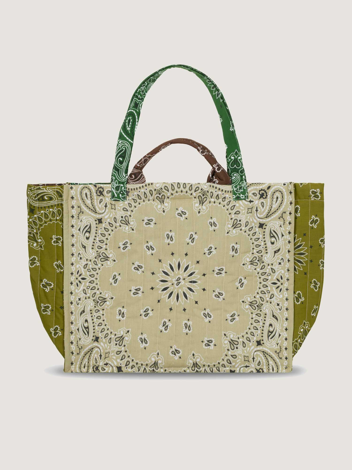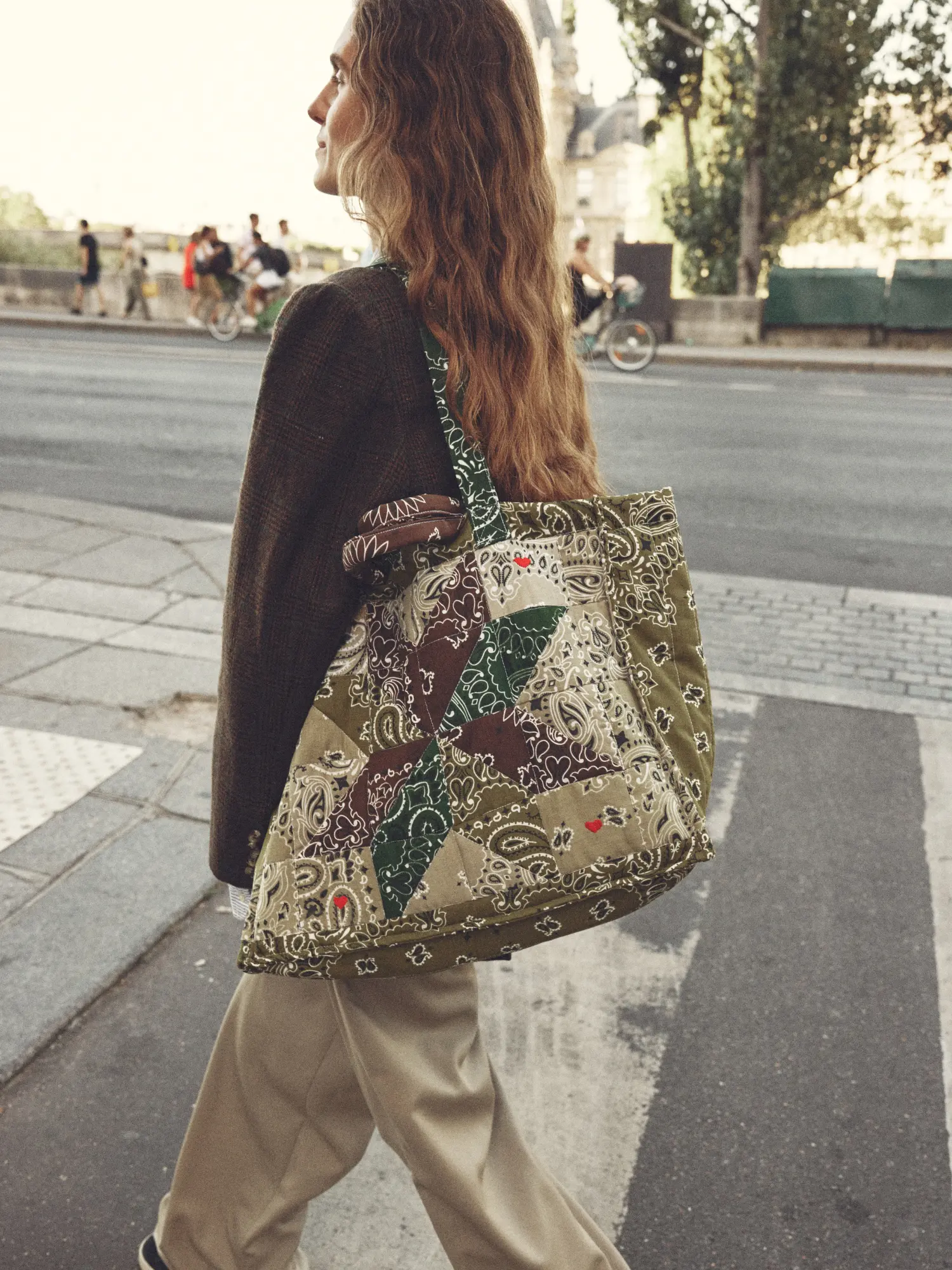 Ce sac est composé d’un patchwork réalisé à partir d’authentiques bandanas américains et de petits motifs brodés à la main. Ce sac est entièrement matelassé afin de le rendre plus résistant. Avec 4 anses, vous pourrez à la fois porter votre sac à l’épaule et à la main.