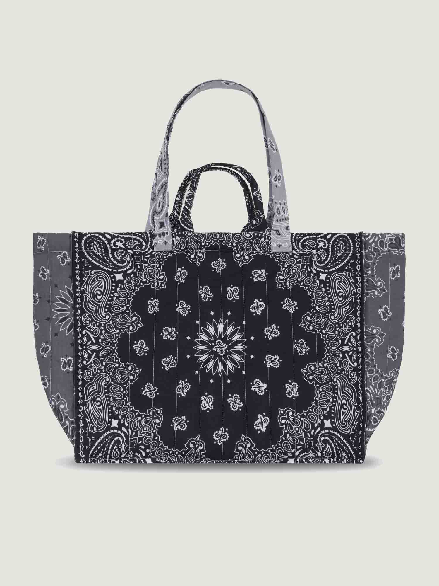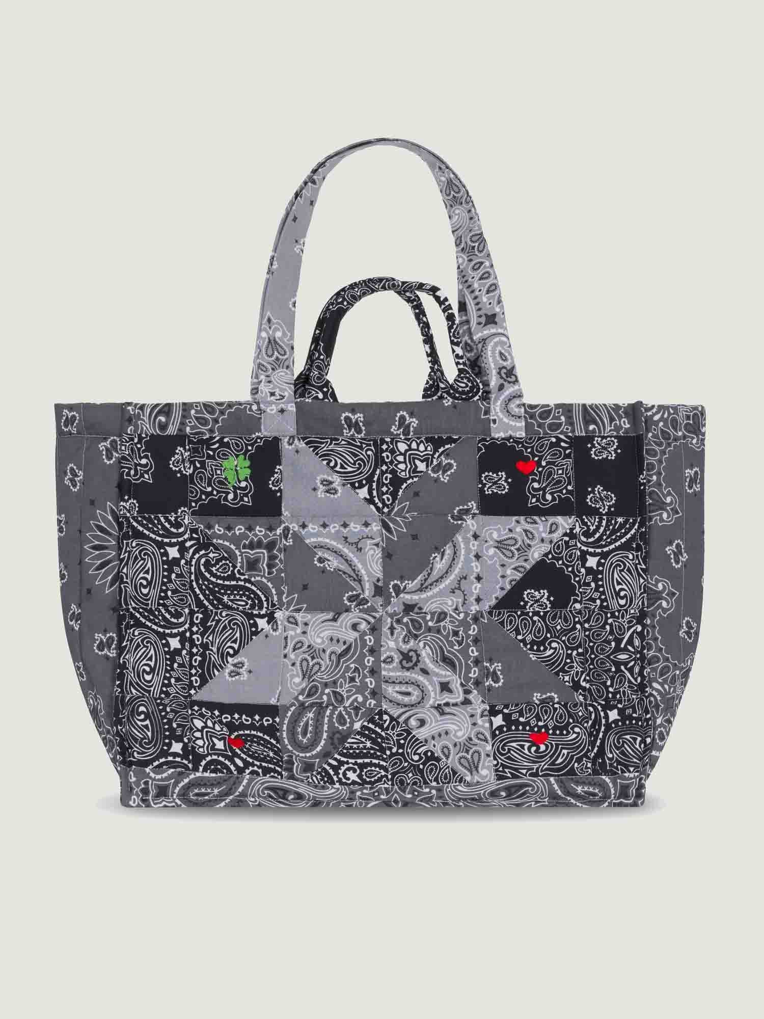Ce sac est composé d’un patchwork réalisé à partir d’authentiques bandanas américains et de petits motifs brodés à la main. Ce sac est entièrement matelassé afin de le rendre plus résistant. Avec 4 anses, vous pourrez à la fois porter votre sac à l’épaule et à la main.