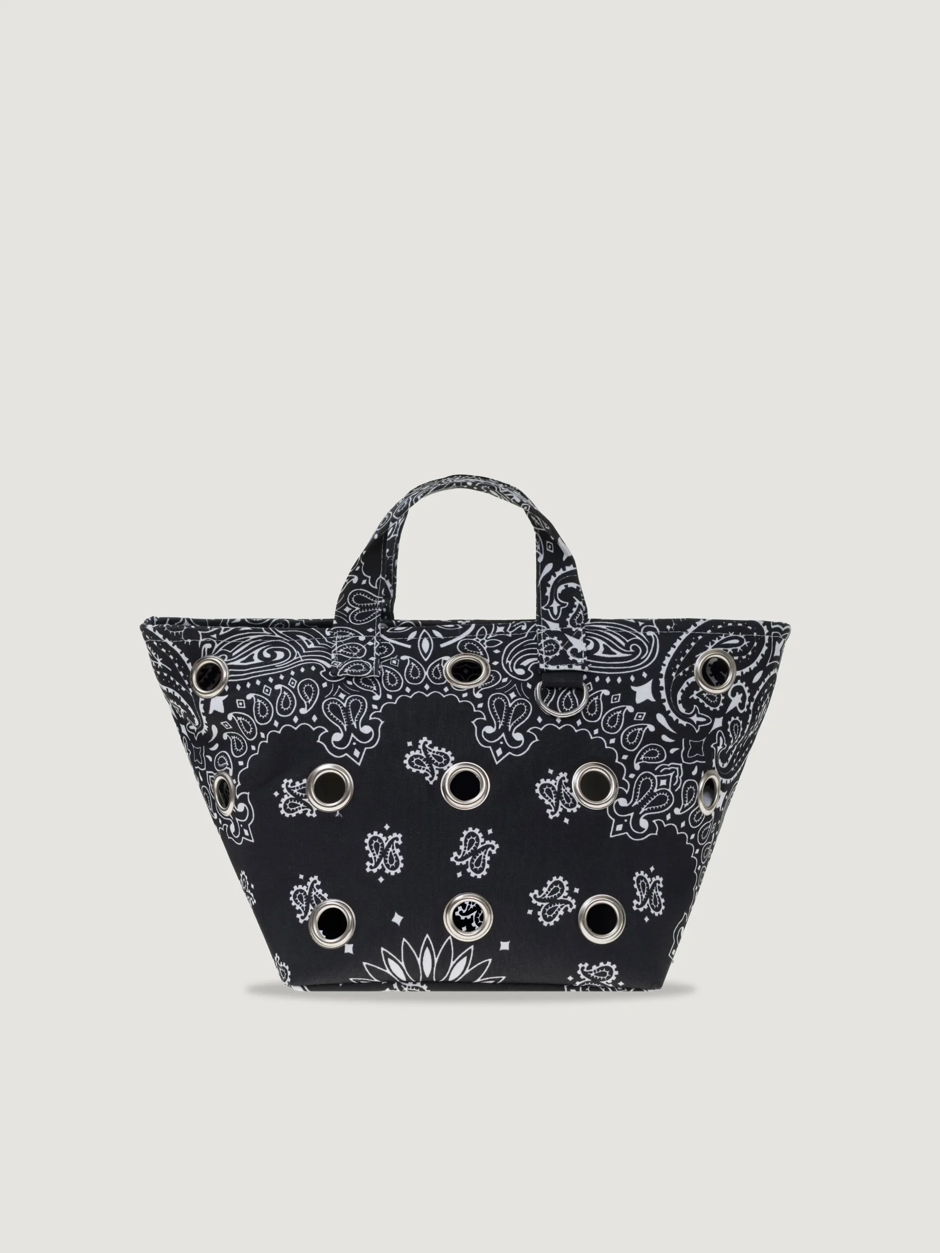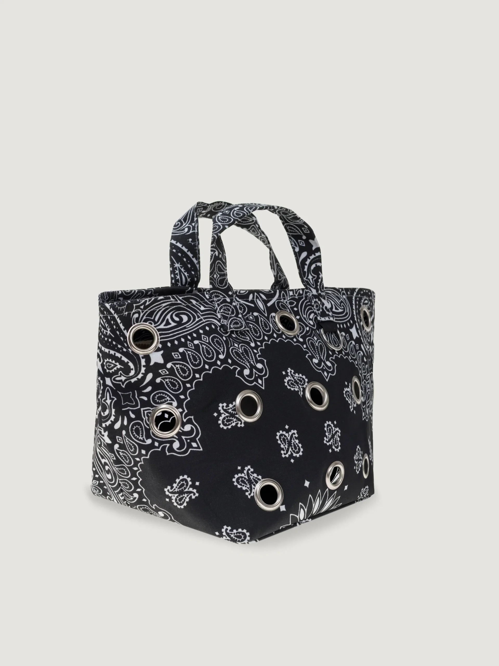 Petit sac panier orné d’œillets, 2 anses pour un porté main, deux petits anneaux pour permettre d’accrocher une bandoulière ou des petits gris-gris.