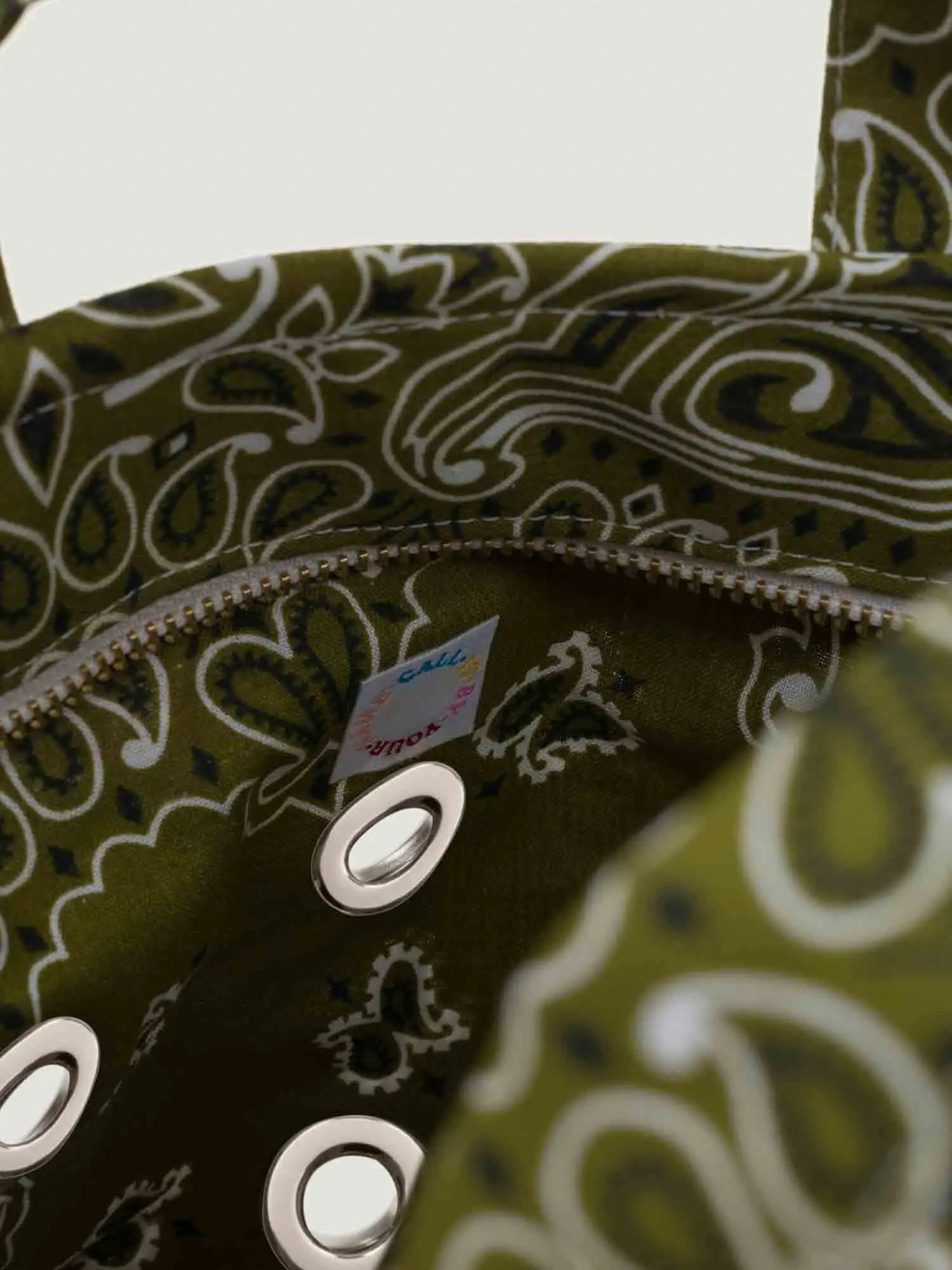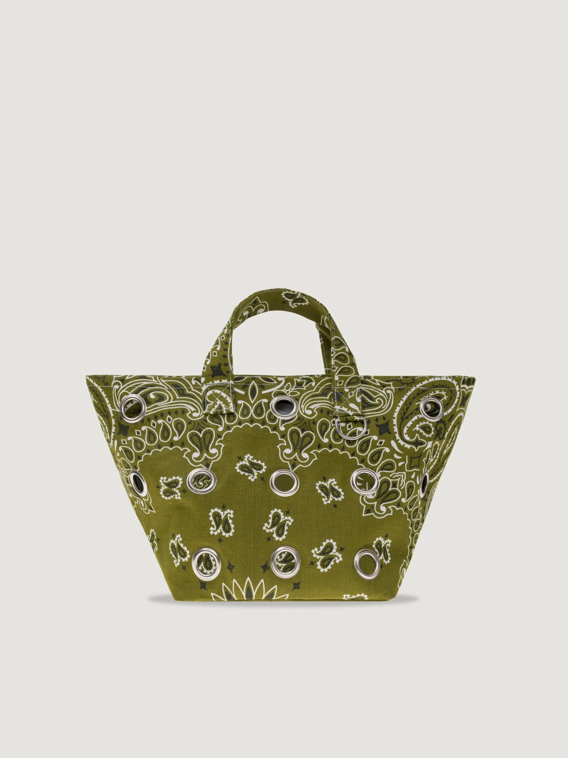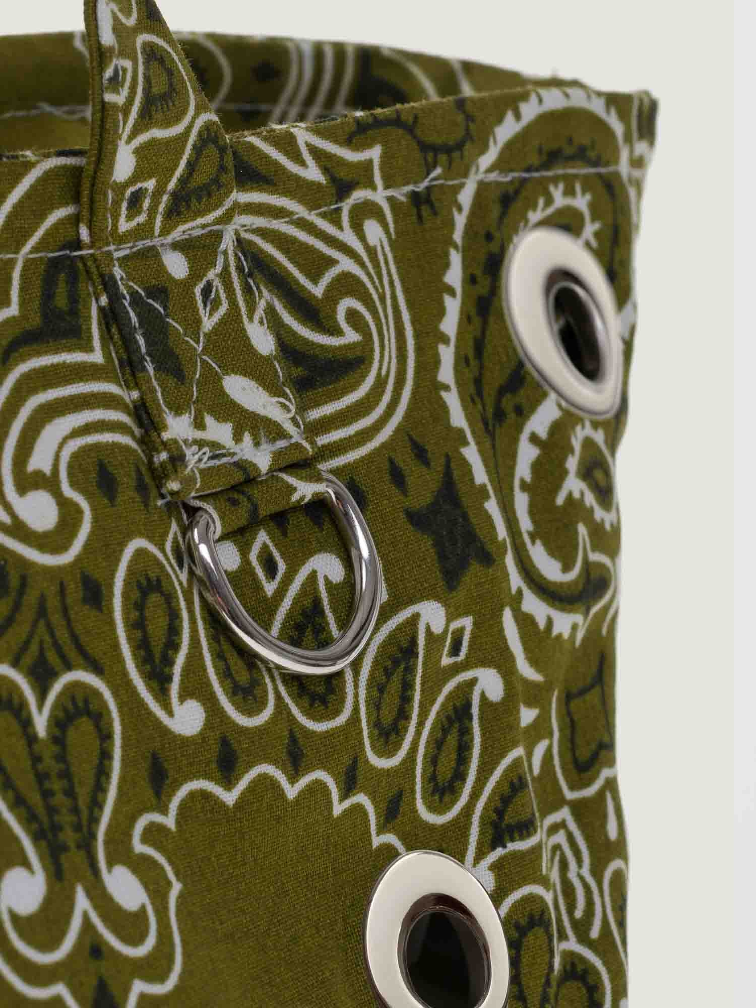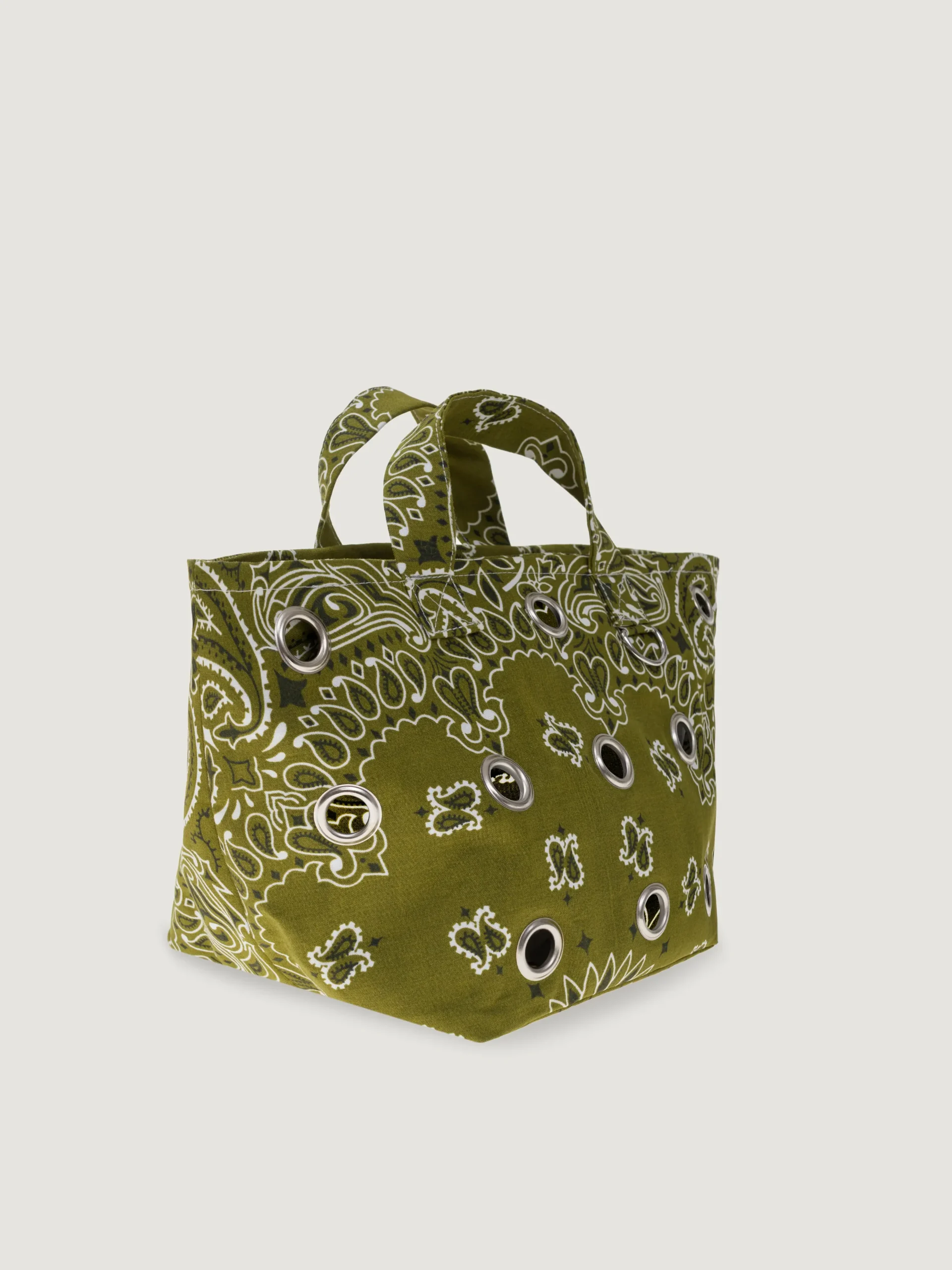 Petit sac panier orné d’œillets, 2 anses pour un porté main, deux petits anneaux pour permettre d’accrocher une bandoulière ou des petits gris-gris.