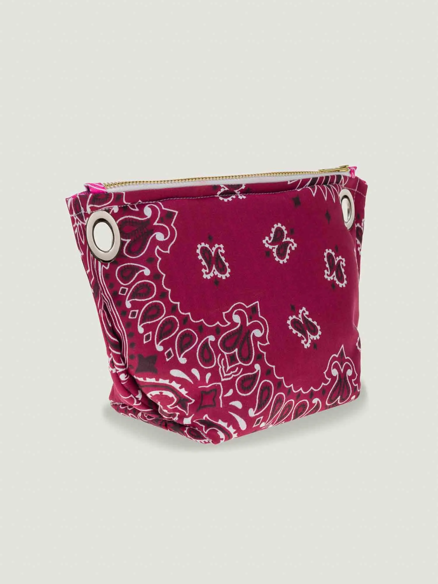 Mini pochette trapèze à œillets, à porter à la main ou avec une bandoulière.