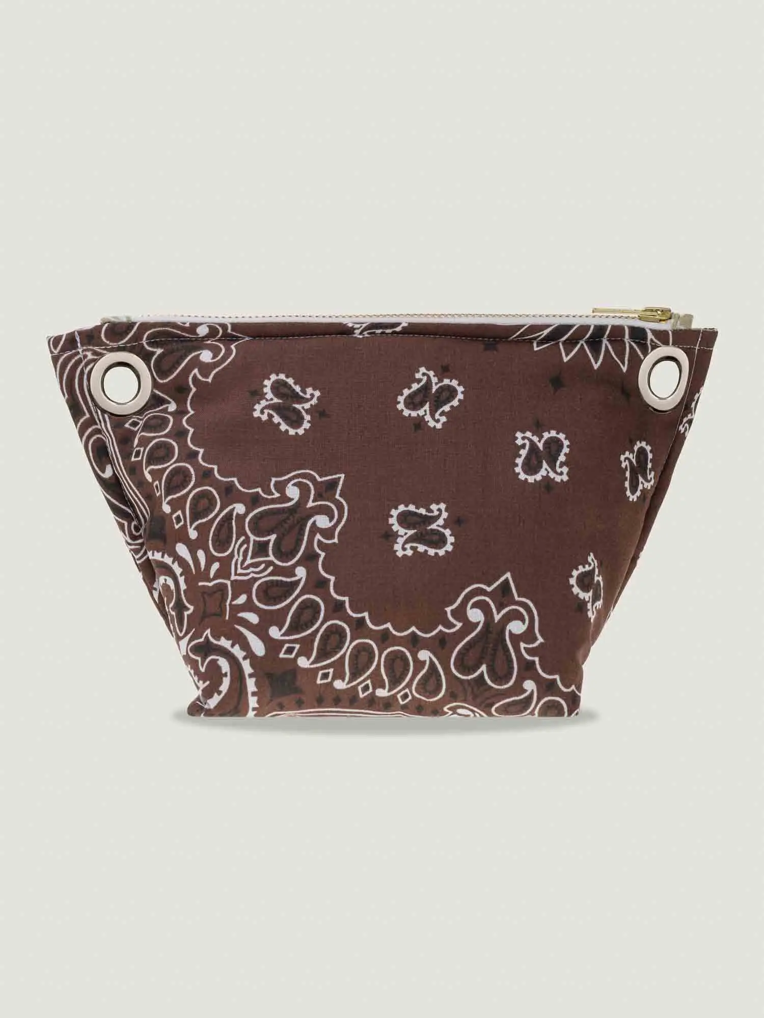 Mini pochette trapèze à œillets, à porter à la main ou avec une bandoulière.