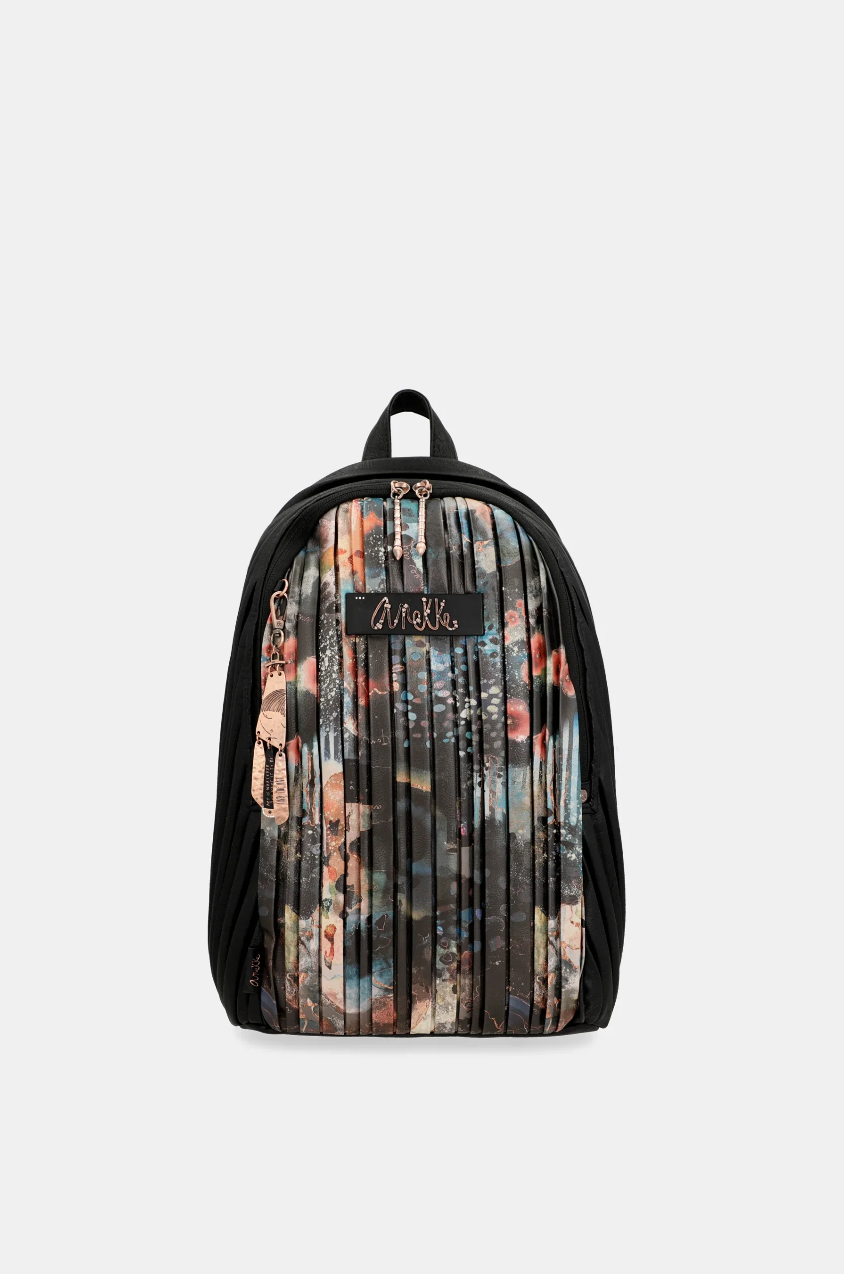 Cette ligne est caractérisée par l’effet plissé du matériau, qui présente une impression inspirée de la peinture sur une base noire, contrastée avec des touches rougeâtres et bleues. Il regorge également de détails uniques, tels que le logo métallique et les épingles et poignées personnalisées. Il est également livré avec l’anneau clé de la collection.