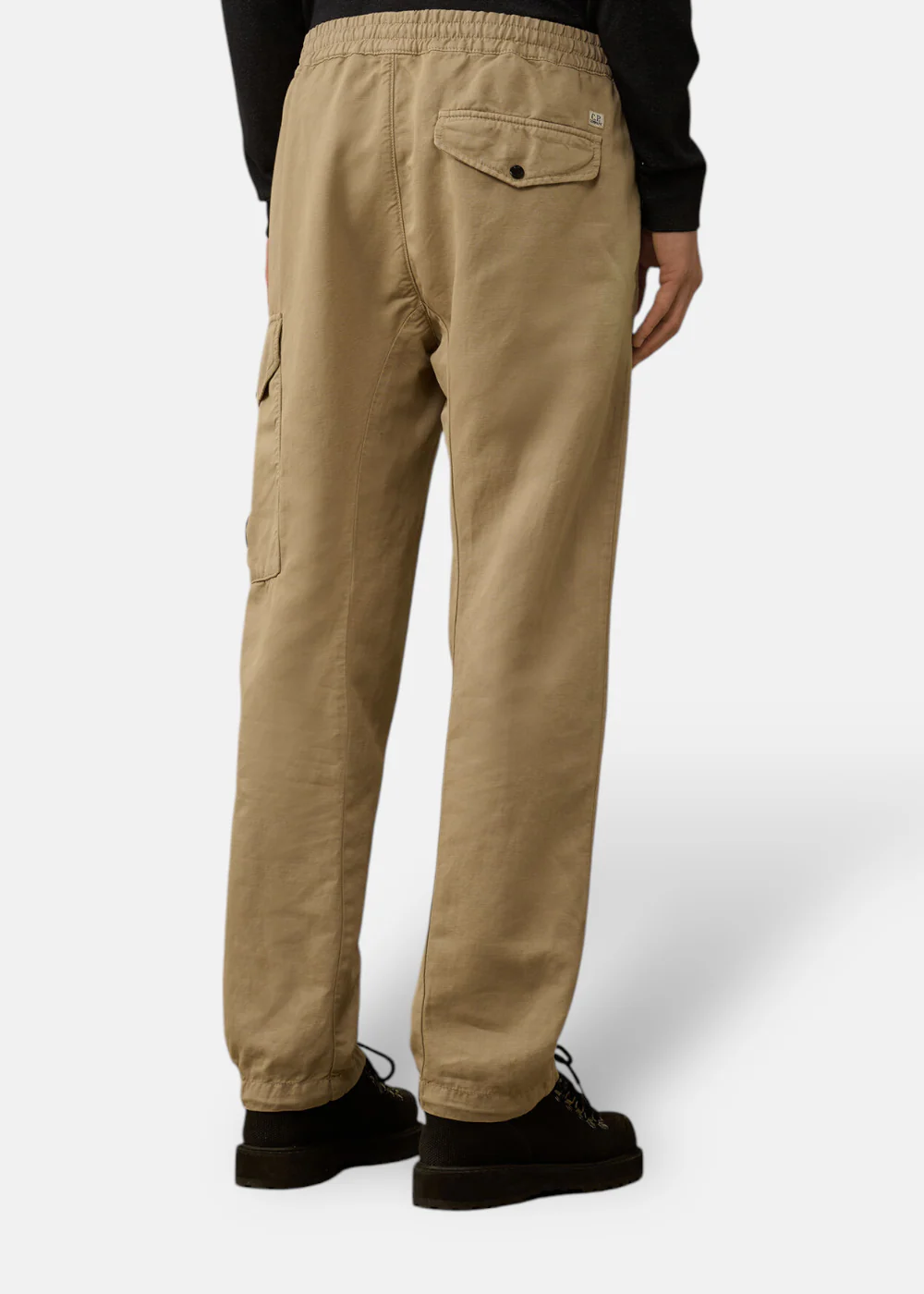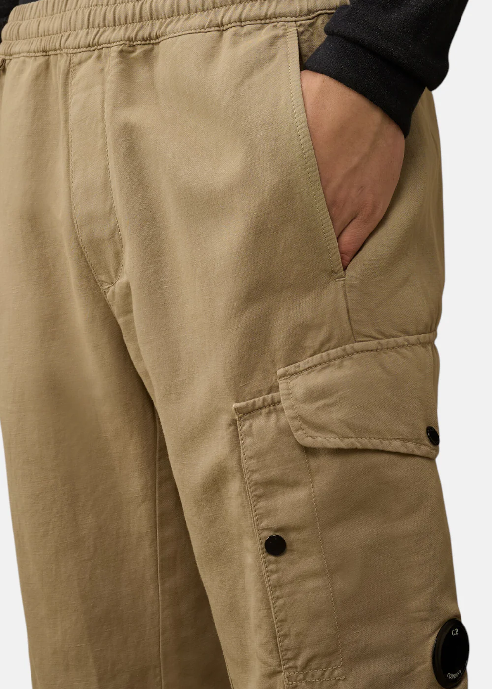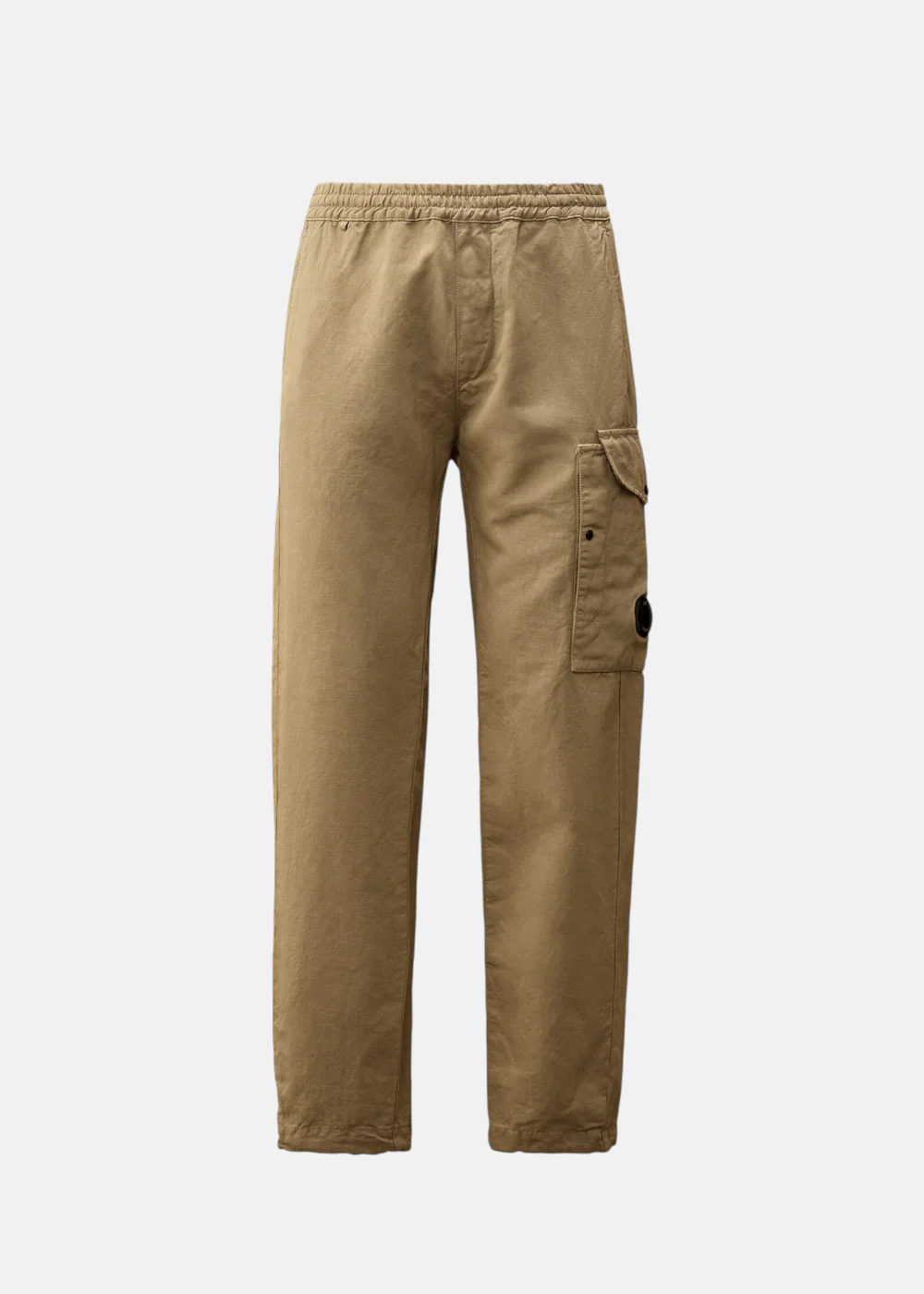 Ce pantalon ample est confectionné en coton/lin teint en pièce, offrant une coupe confortable et une finition unique. Il est doté de poches latérales, de poches cargo à rabat avec un détail signature en forme de verre de lunette, et d’une poche arrière à rabat avec boutons-pression et étiquette logo appliquée. Les ourlets ajustables avec cordon de serrage ajoutent une touche pratique.