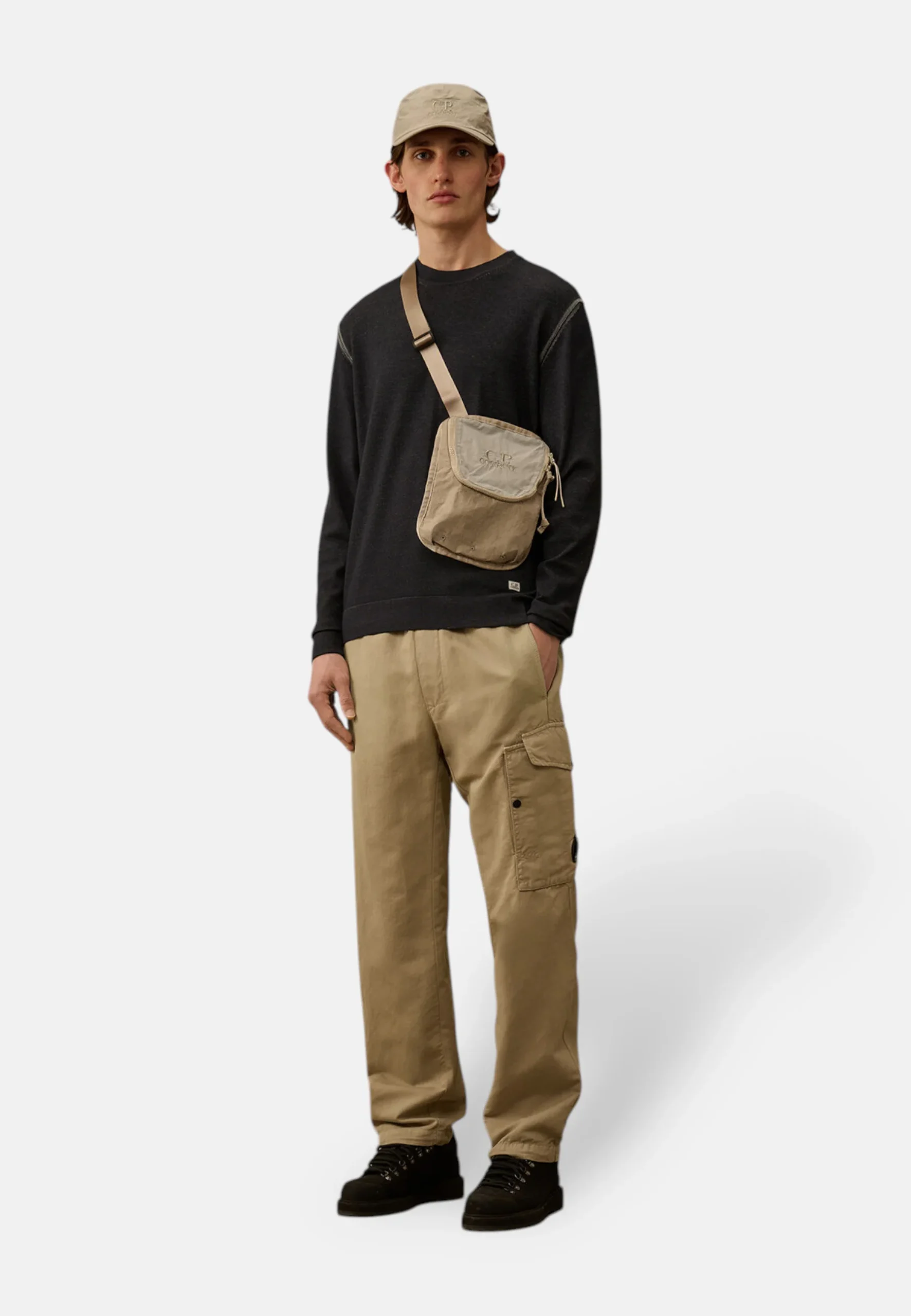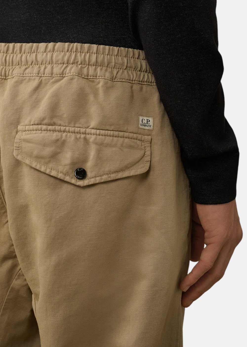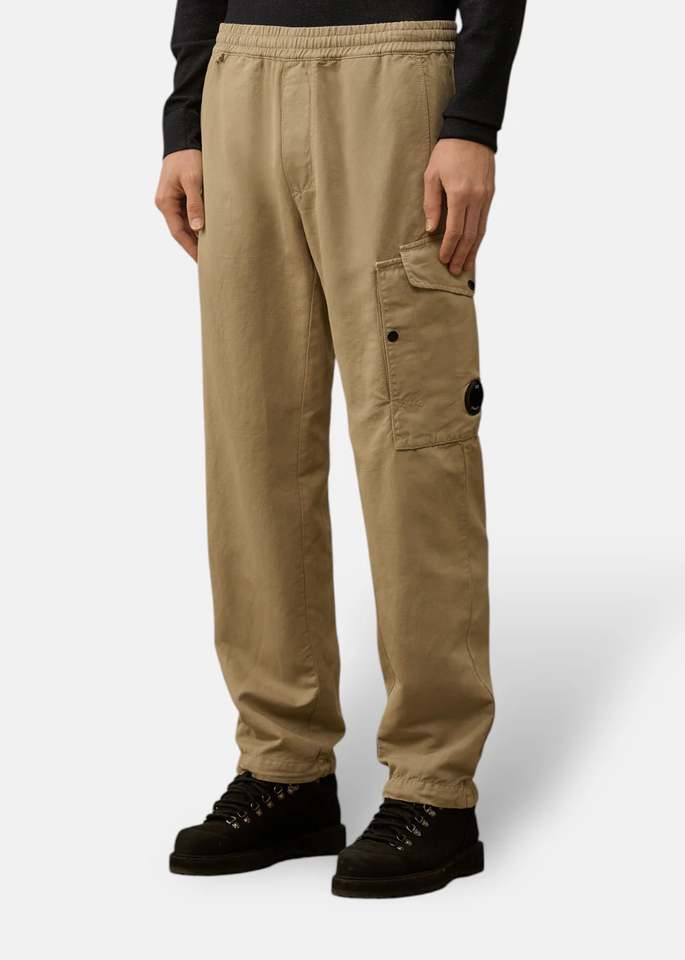 Ce pantalon ample est confectionné en coton/lin teint en pièce, offrant une coupe confortable et une finition unique. Il est doté de poches latérales, de poches cargo à rabat avec un détail signature en forme de verre de lunette, et d’une poche arrière à rabat avec boutons-pression et étiquette logo appliquée. Les ourlets ajustables avec cordon de serrage ajoutent une touche pratique.