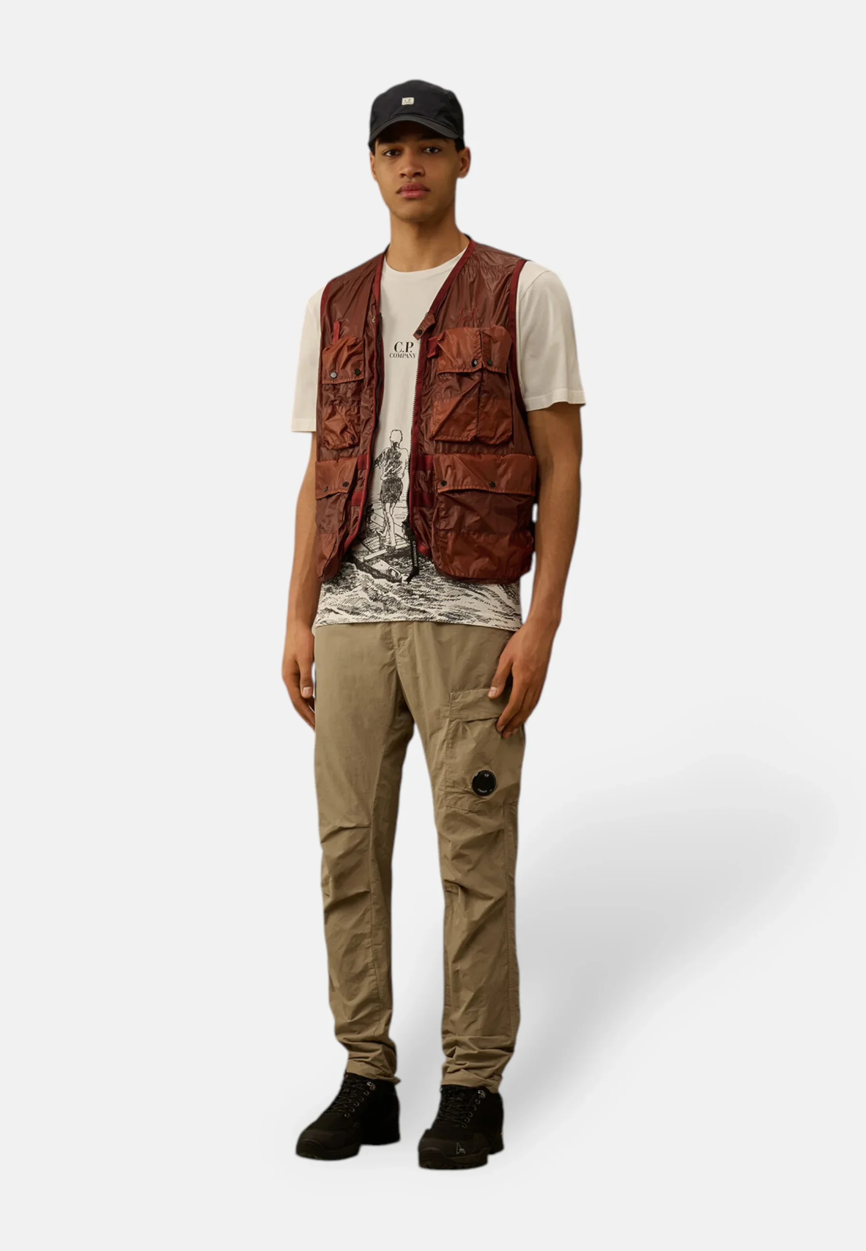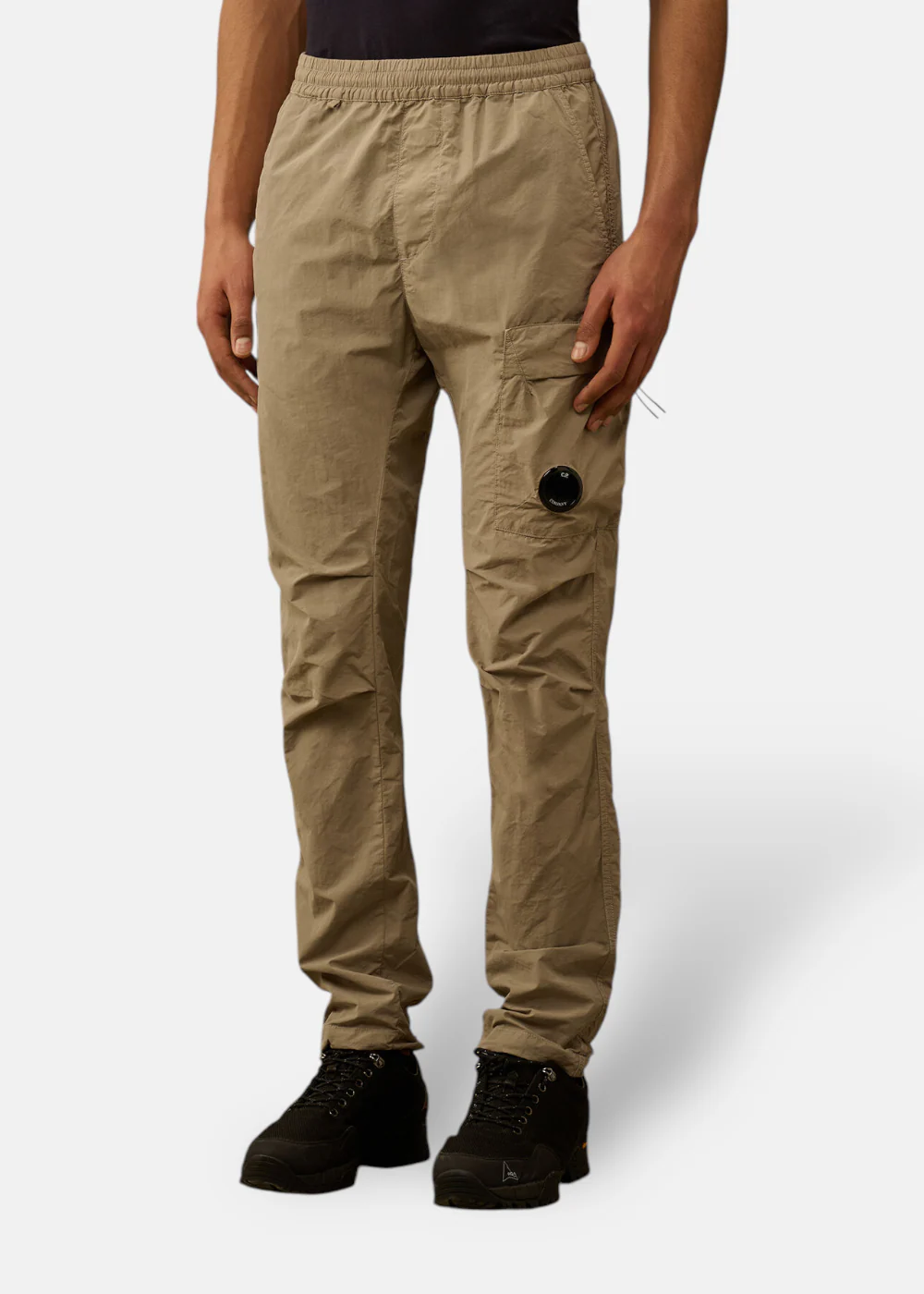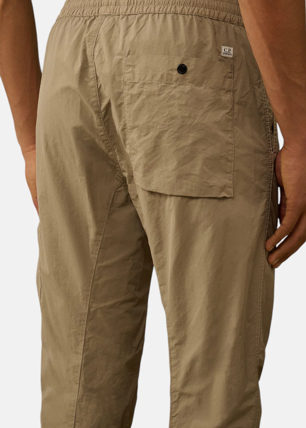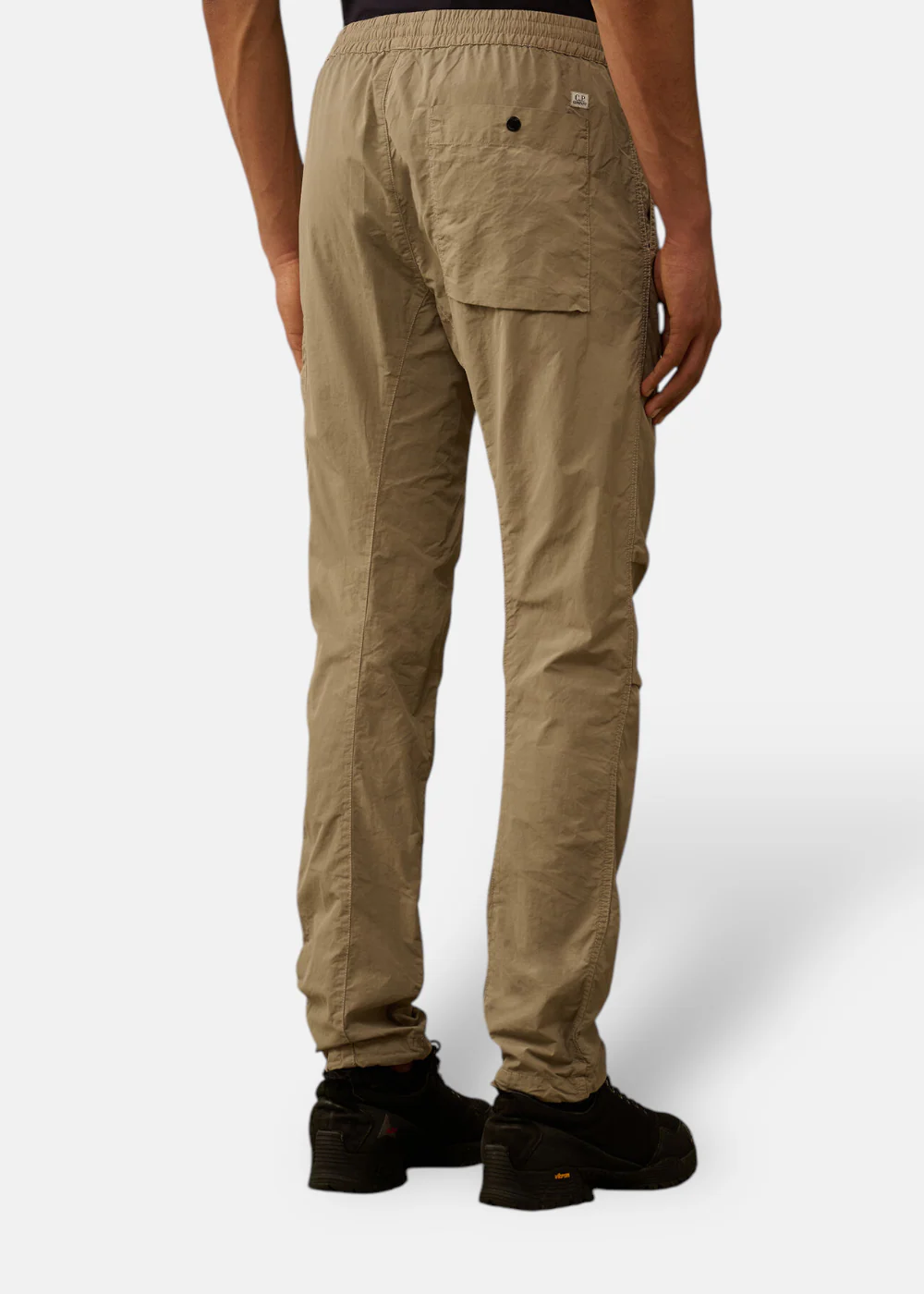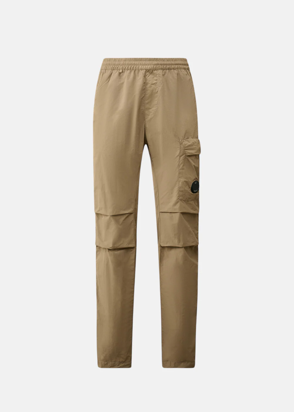 Ce pantalon cargo est confectionné en Flatt Nylon, un nylon opaque émerisé traité anti-goutte pour une finition de qualité. Teint en pièce, il présente une coupe régulière et des détails pratiques, notamment des poches zippées latérales, des poches cargo à rabat avec zip et boutons-pression, ainsi qu’un détail en forme de verre de lunette. Il offre également une poche arrière à rabat et une étiquette logo appliquée au dos.