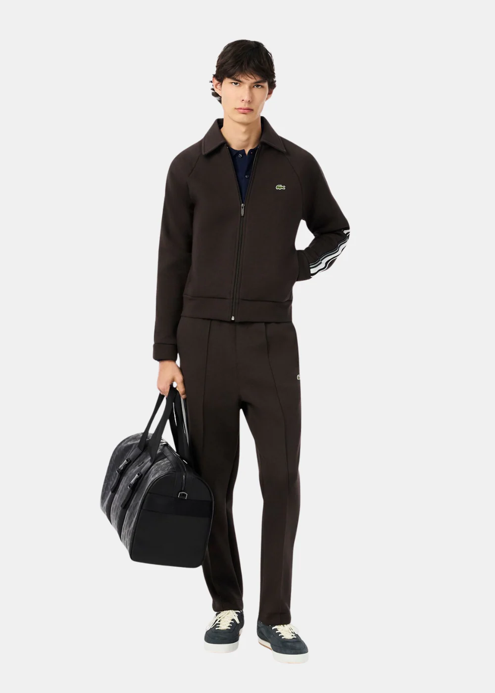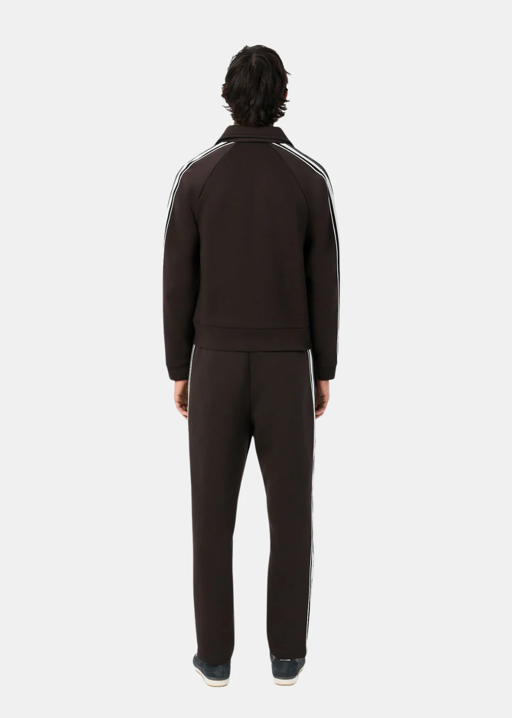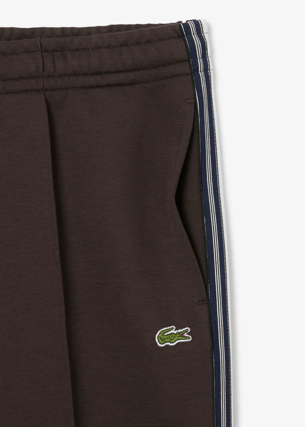 Fabriqué en France, ce pantalon de survêtement Lacoste de coloris porto associe confort et élégance sportive. Son jersey coton double face, ses plis cousus et ses bandes rayées contrastantes en font une pièce premium.