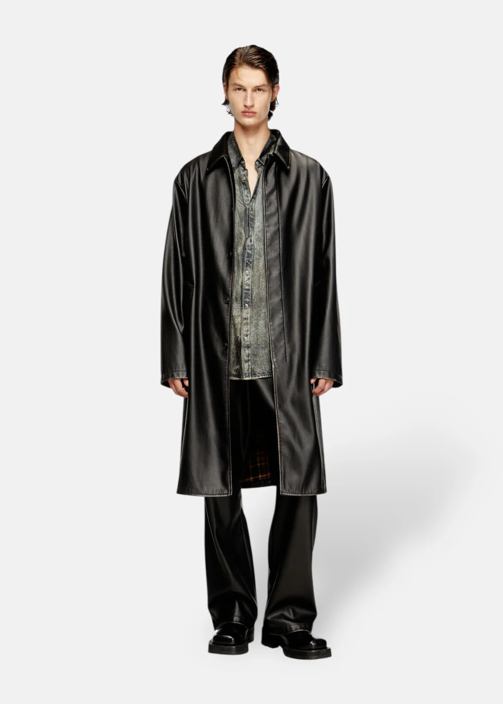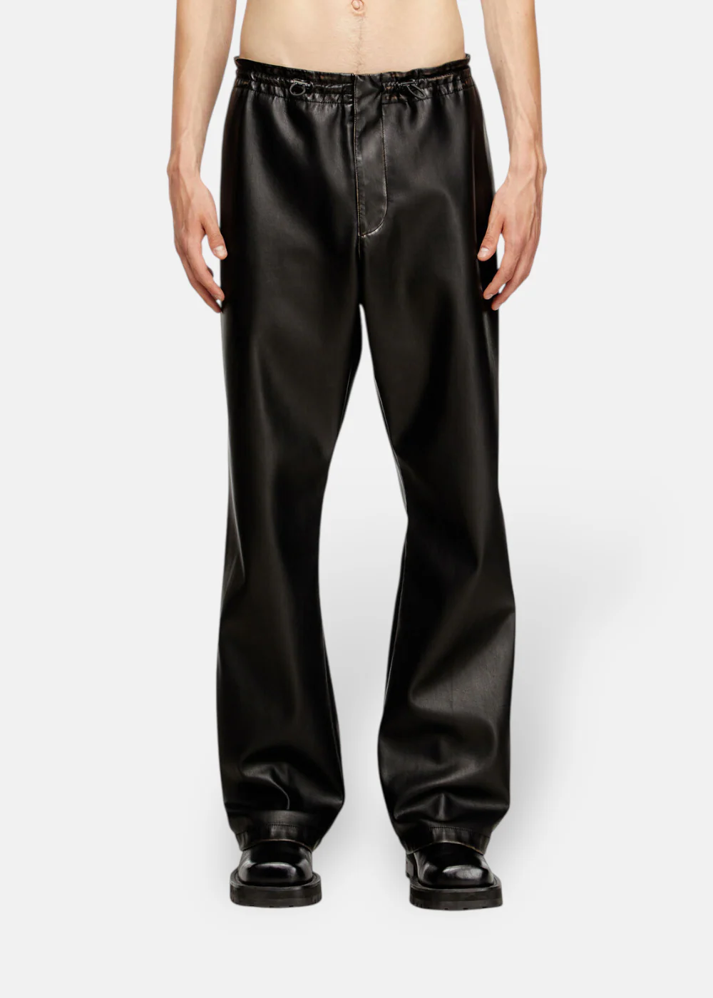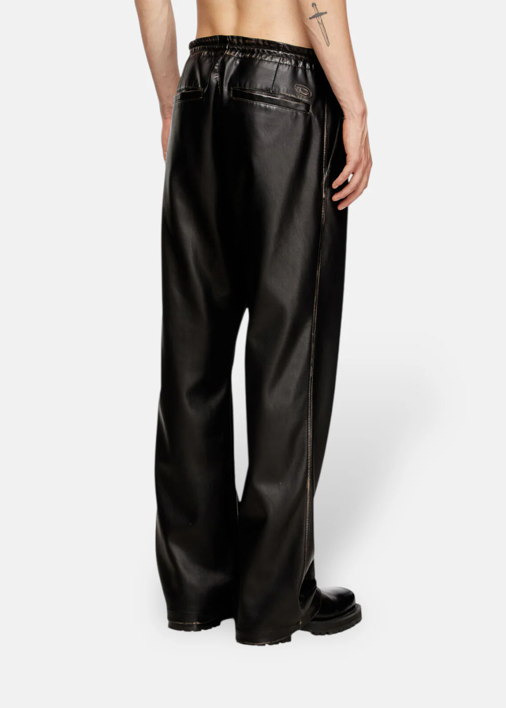 Pantalon noir au fini cuir vieilli, coupe regular. Tissu technique brossé à la main, taille élastique à cordon & logo Oval D embossé. Audace et confort signés Diesel.