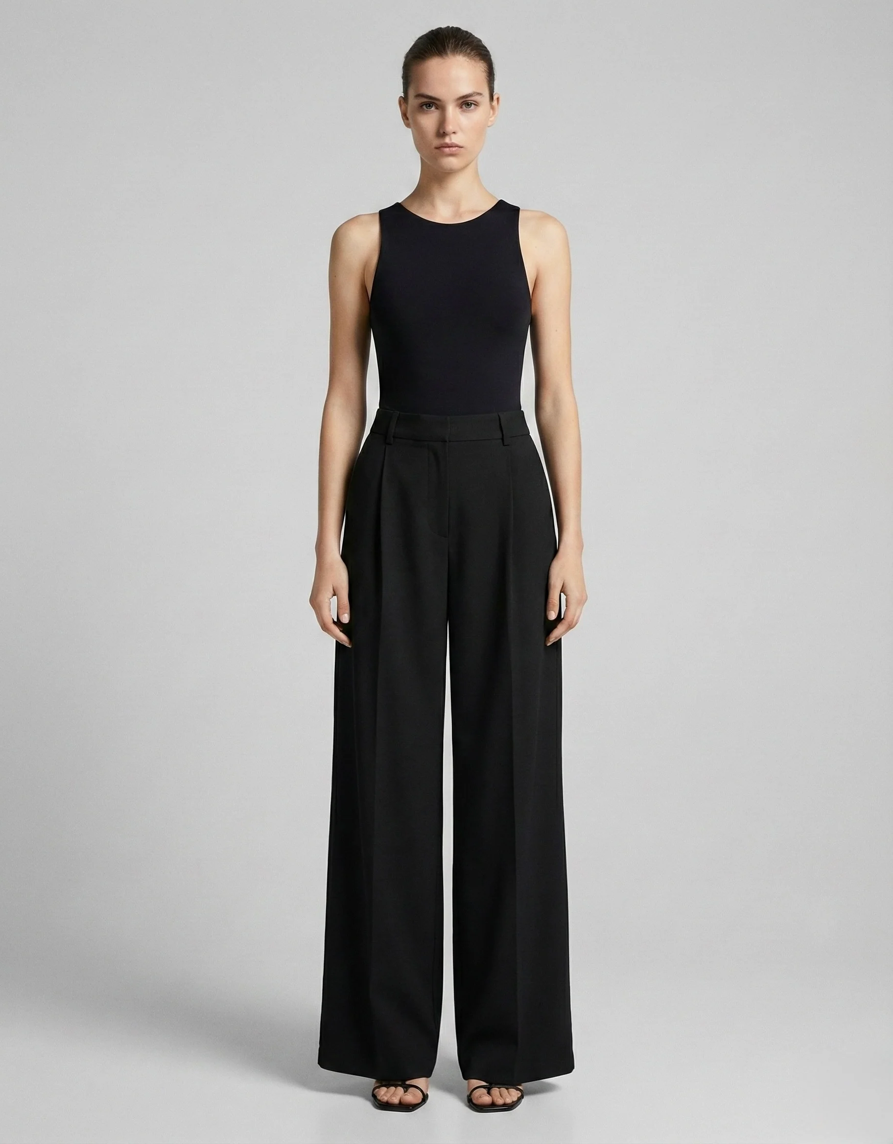 Taille haute avec pinces profondes, jambe large fluide, passants renforcés, fermeture frontale, rendu structuré