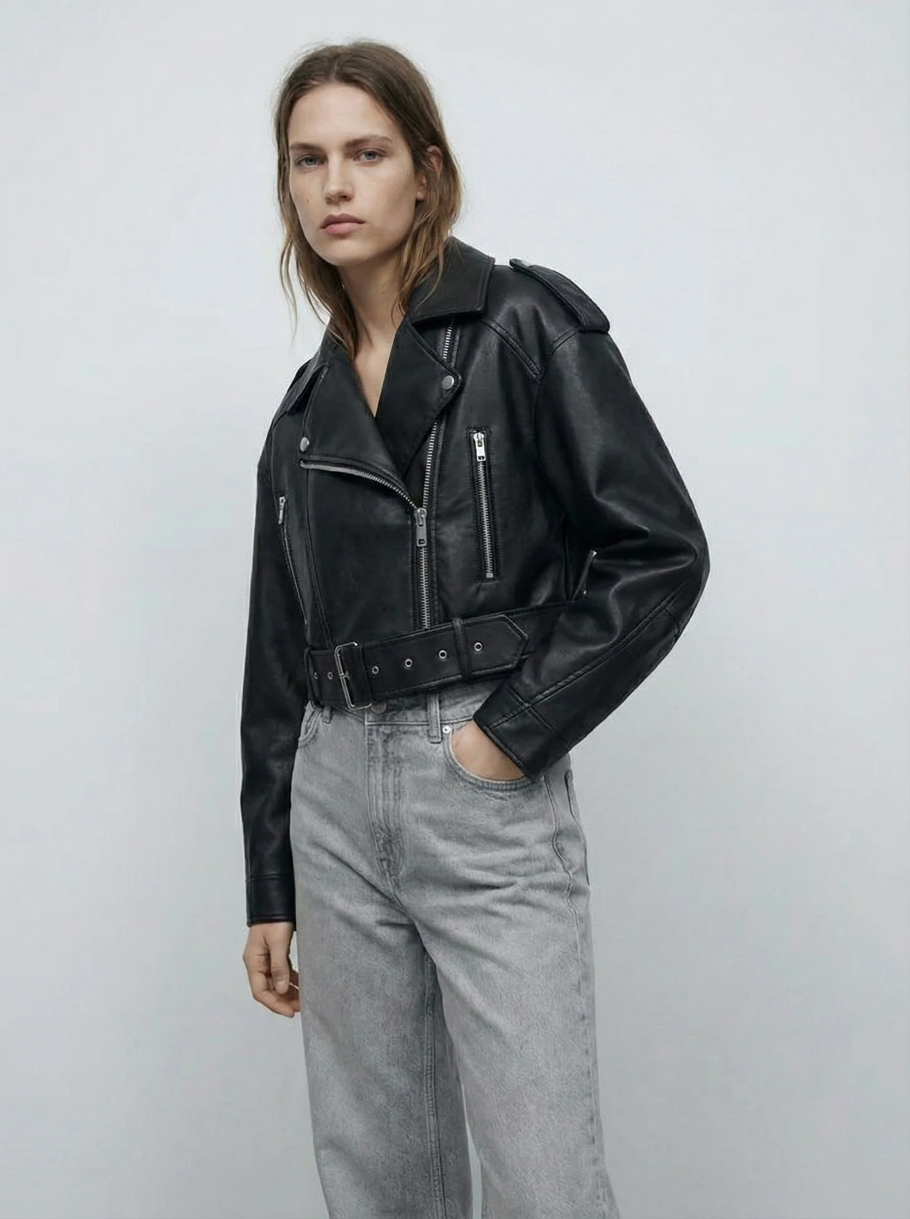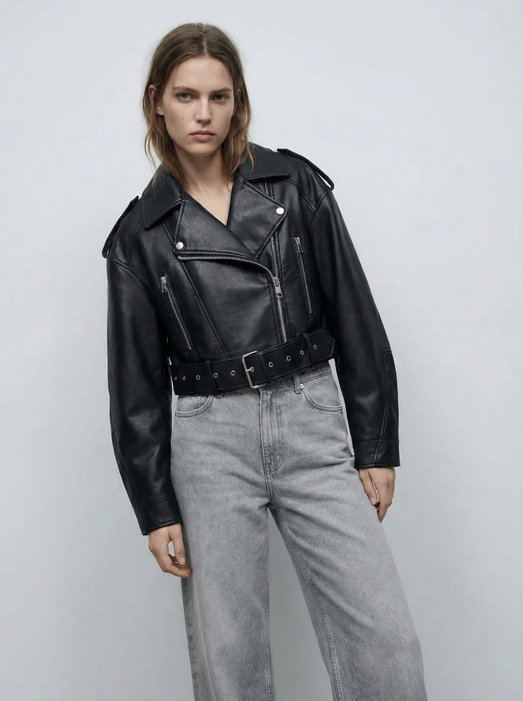Veste courte d’inspiration perfecto avec col à revers cranté. Fermeture zippée asymétrique, poches zippées sur le devant et ceinture intégrée à la base. Manches longues à coupe structurée