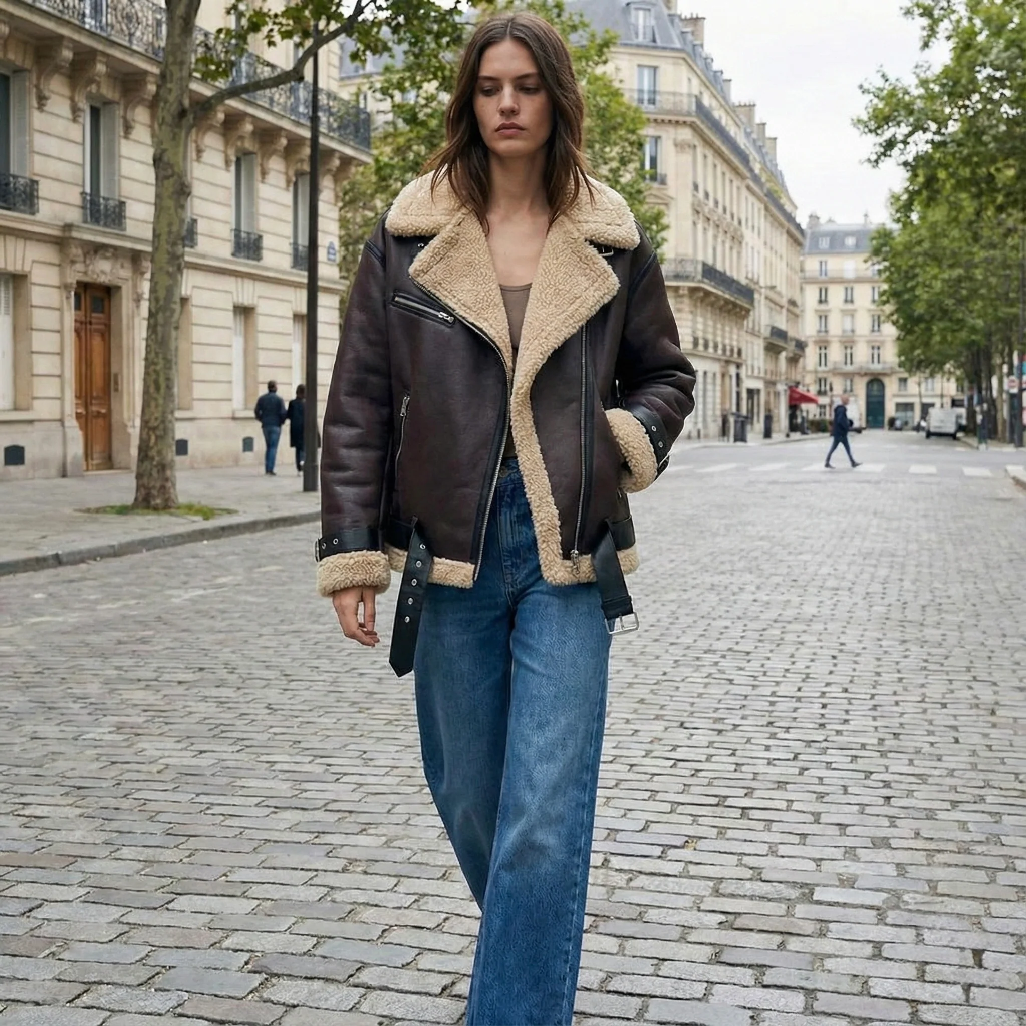 Veste d’inspiration perfecto à coupe droite, col large doublé en matière texturée et fermeture zippée asymétrique. Poches zippées sur le devant, ceinture intégrée à la base et manches longues à revers contrastés