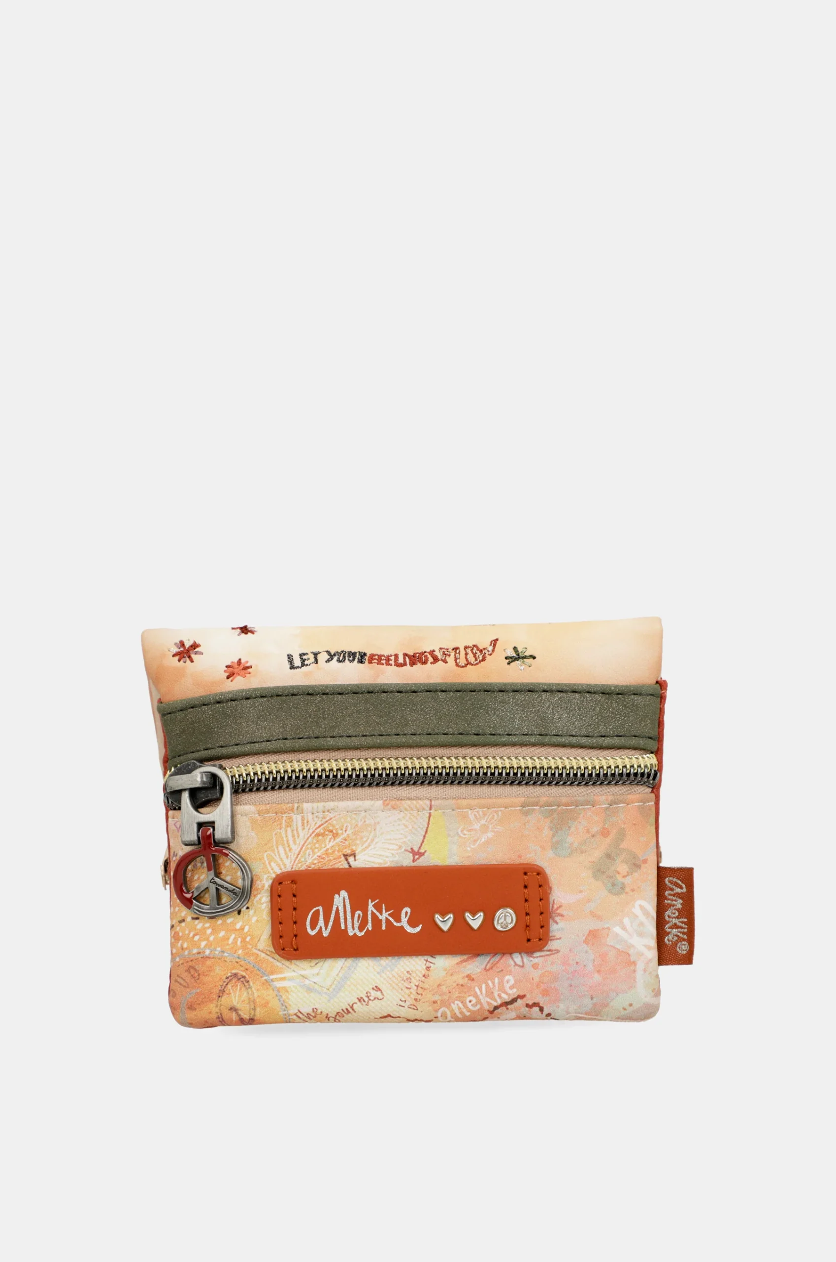 Ce modèle de porte-monnaie comporte un rabat, qui, une fois ouvert donne accès à deux compartiments : l’un d’eux est doté d’une fermeture type porte-monnaie. Une poche zippée se trouve au dos. L’intérieur est entièrement doublé.