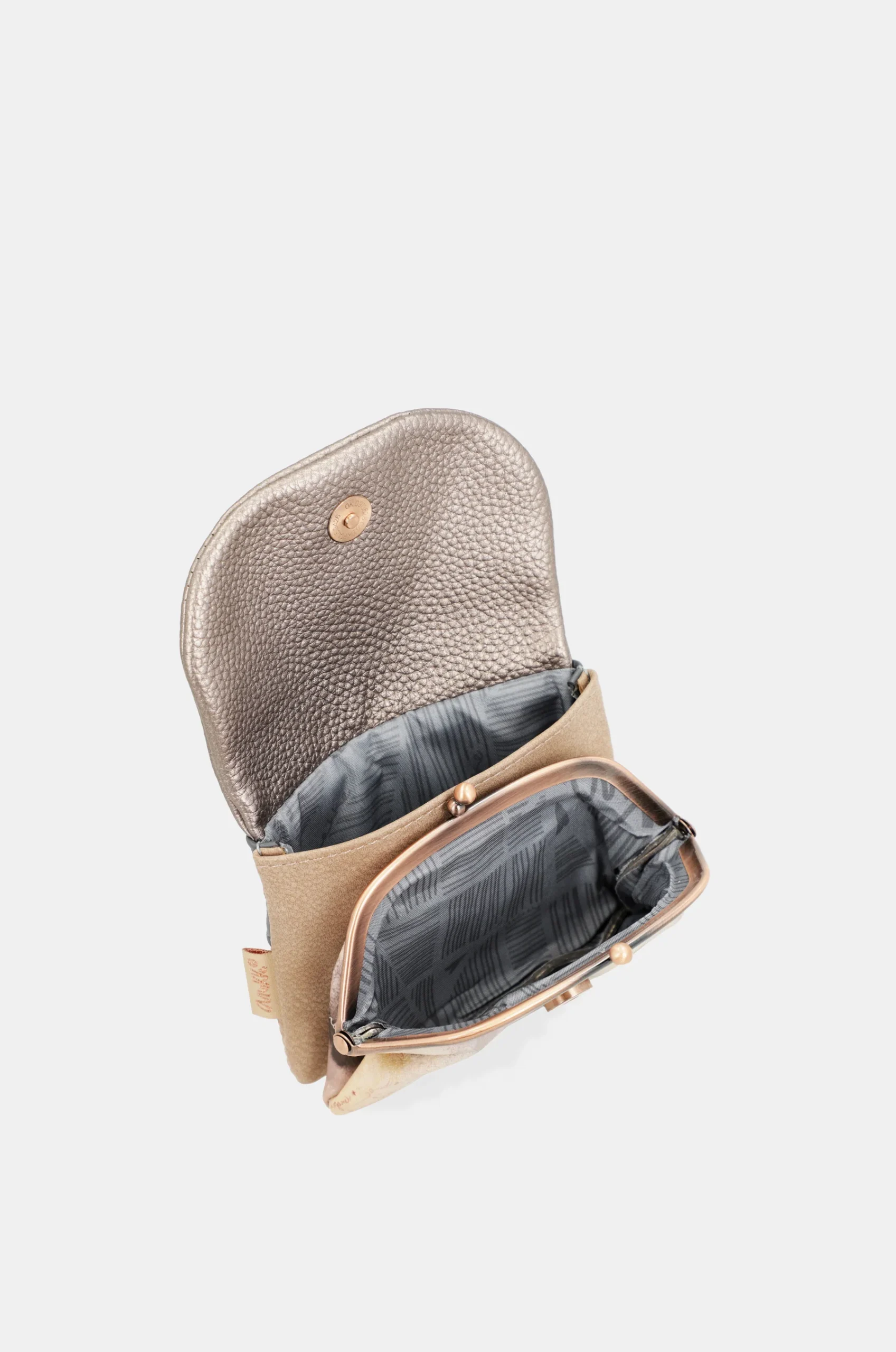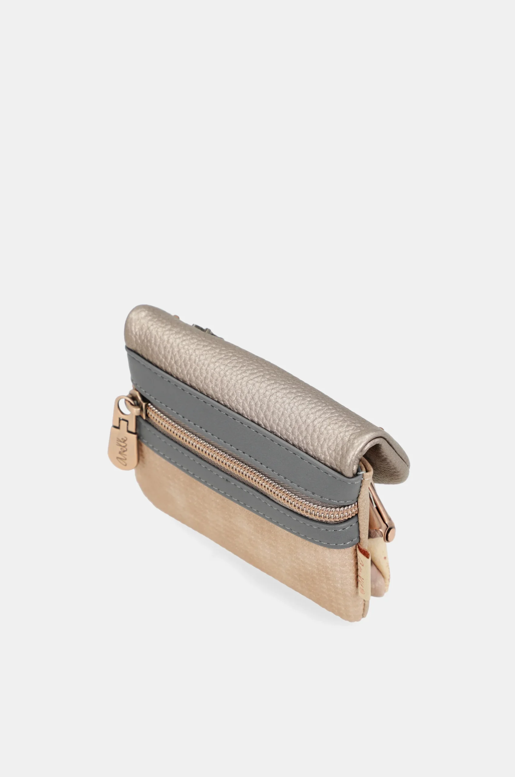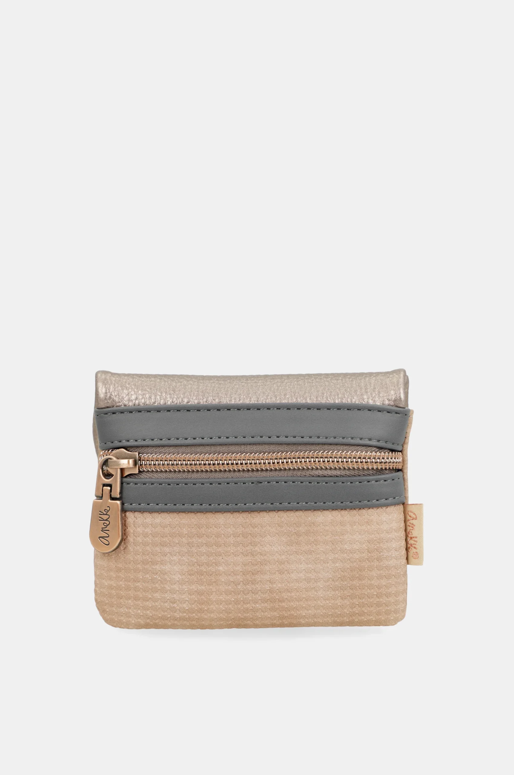 Ce modèle de porte-monnaie comporte un rabat, qui, une fois ouvert donne accès à deux compartiments : l’un d’eux est doté d’une fermeture type porte-monnaie. Une poche zippée se trouve au dos. L’intérieur est entièrement doublé.