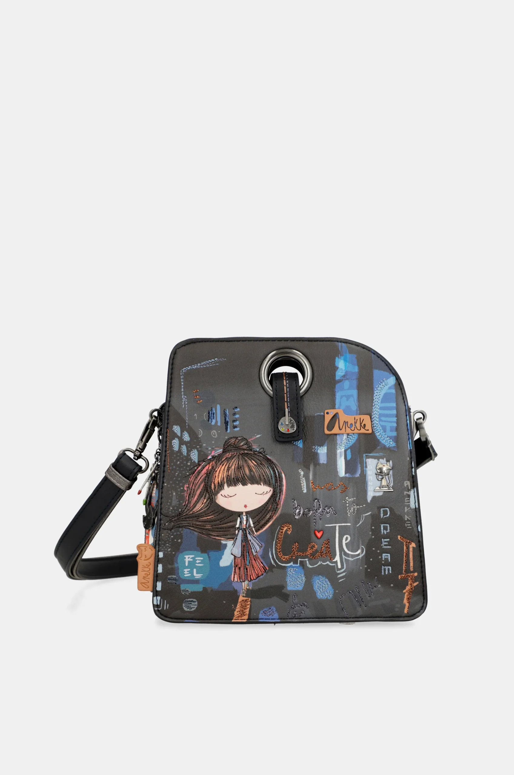 Ce sac de messager à 3 compartiments présente une forme géométrique originale et fait partie de la collection Anekke Contemporary. Il s’agit d’un modèle de petite à moyenne taille, qui s’ouvre au moyen de l’onglet qui passe à travers la boucle métallique ronde. L’intérieur, qui est doublé, a 3 compartiments distincts pour plus de commodité. La poignée est réglable à différentes longueurs.