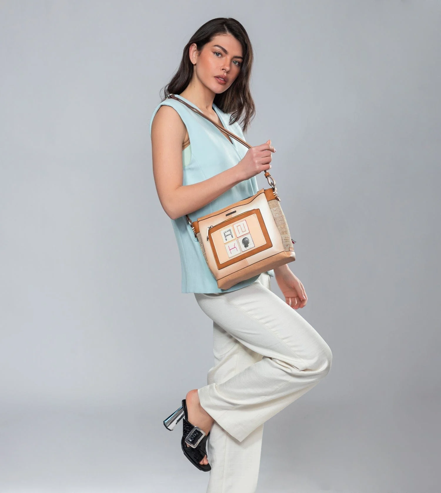 La poignée est un bandoulière réglable à différentes longueurs, parfait pour l’adapter à la hauteur que vous préférez. L’intérieur est bordé d’un tissu d’origine imprimé avec des motifs de la collection, et a des poches.