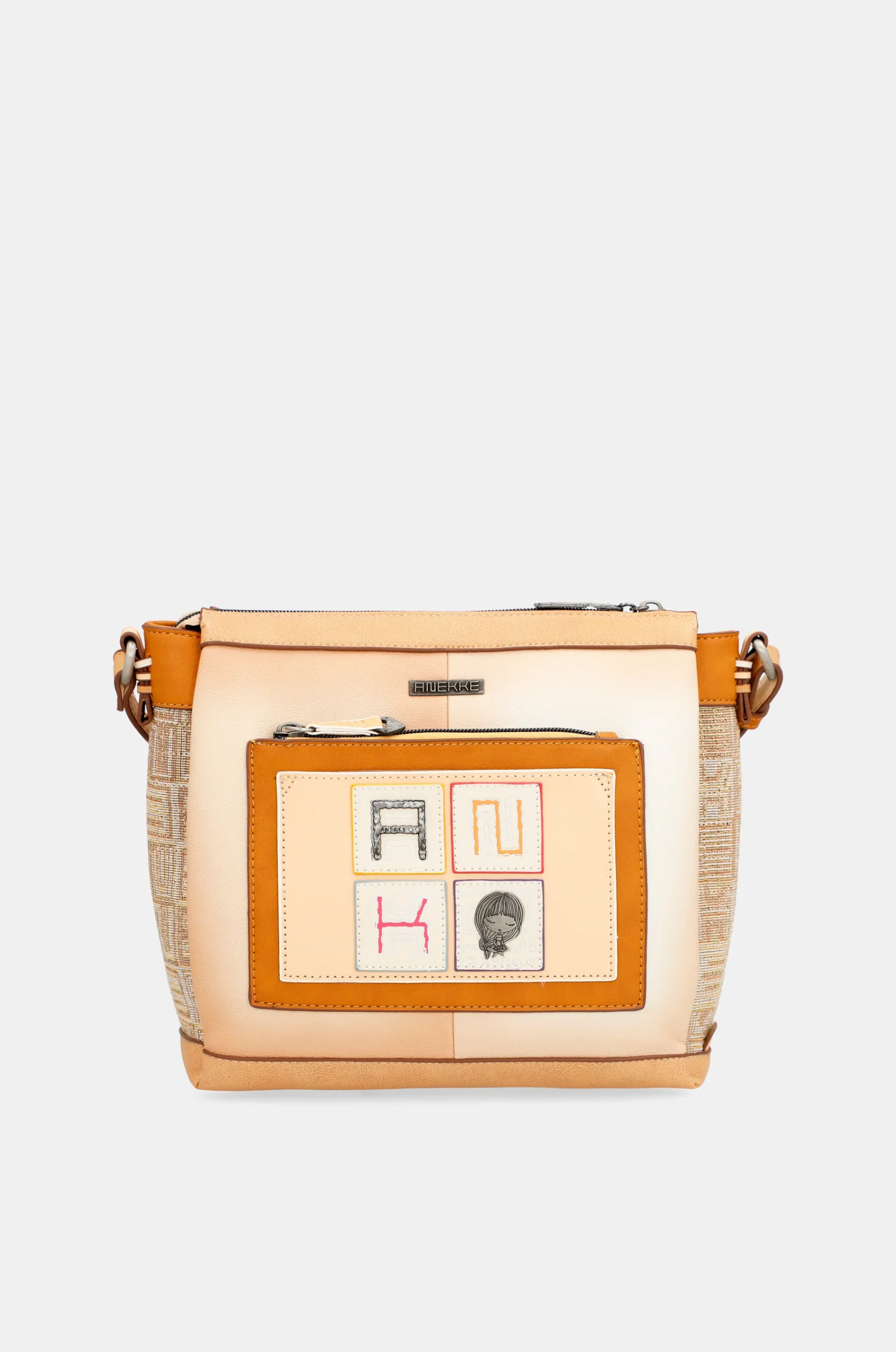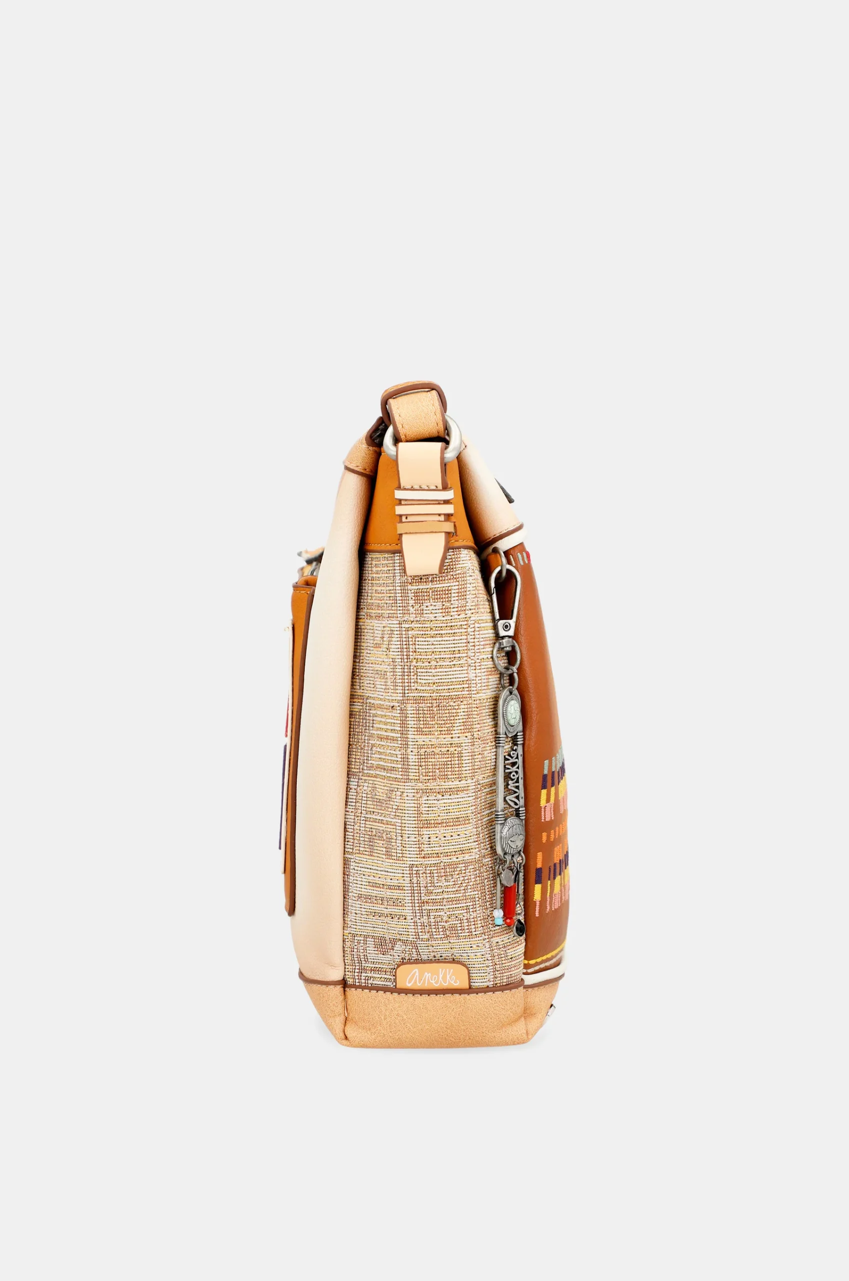 Les côtés et les dos combinent un tissu jacquard imprimé avec des motifs inspirés de l’artisanat amazonien, dans des tons grillés et ecru. Le dos a des patchs décoratifs originaux inspirés par le Kene: des motifs artisanaux fabriqués par certains groupes autochtones de l’Amazonie. Ces formes sont utilisées pour donner forme aux 3 lettres principales d’Anekke.