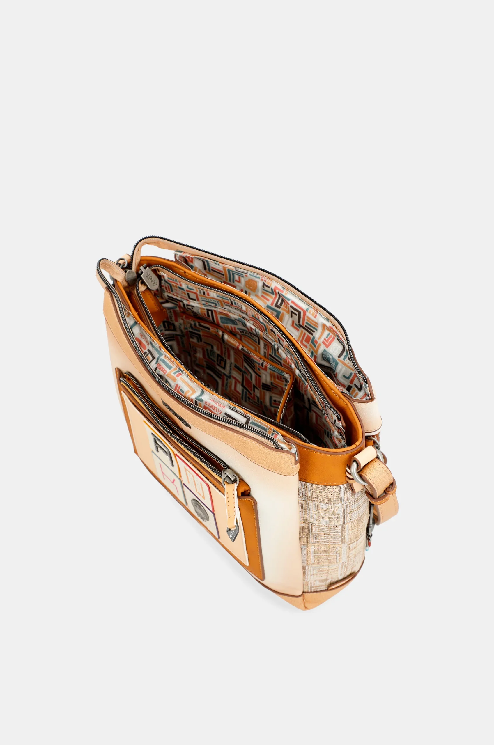 Cette épaule Baghas 3 compartiments indépendants, a une taille moyenne et a une poche arrière. L’avant de ce sac combine une base brune avec des coutures et de la broderie dans différentes couleurs: orange, rose, jaune, jaune, aigue-marine et bleu marine. Ces phrases brodées ont des phrases ou des mots représentatifs qui lisent en mode miroir. Ces phrases brodées ont des phrases ou des mots représentatifs qui sont lus en mode miroir, les découvrent!