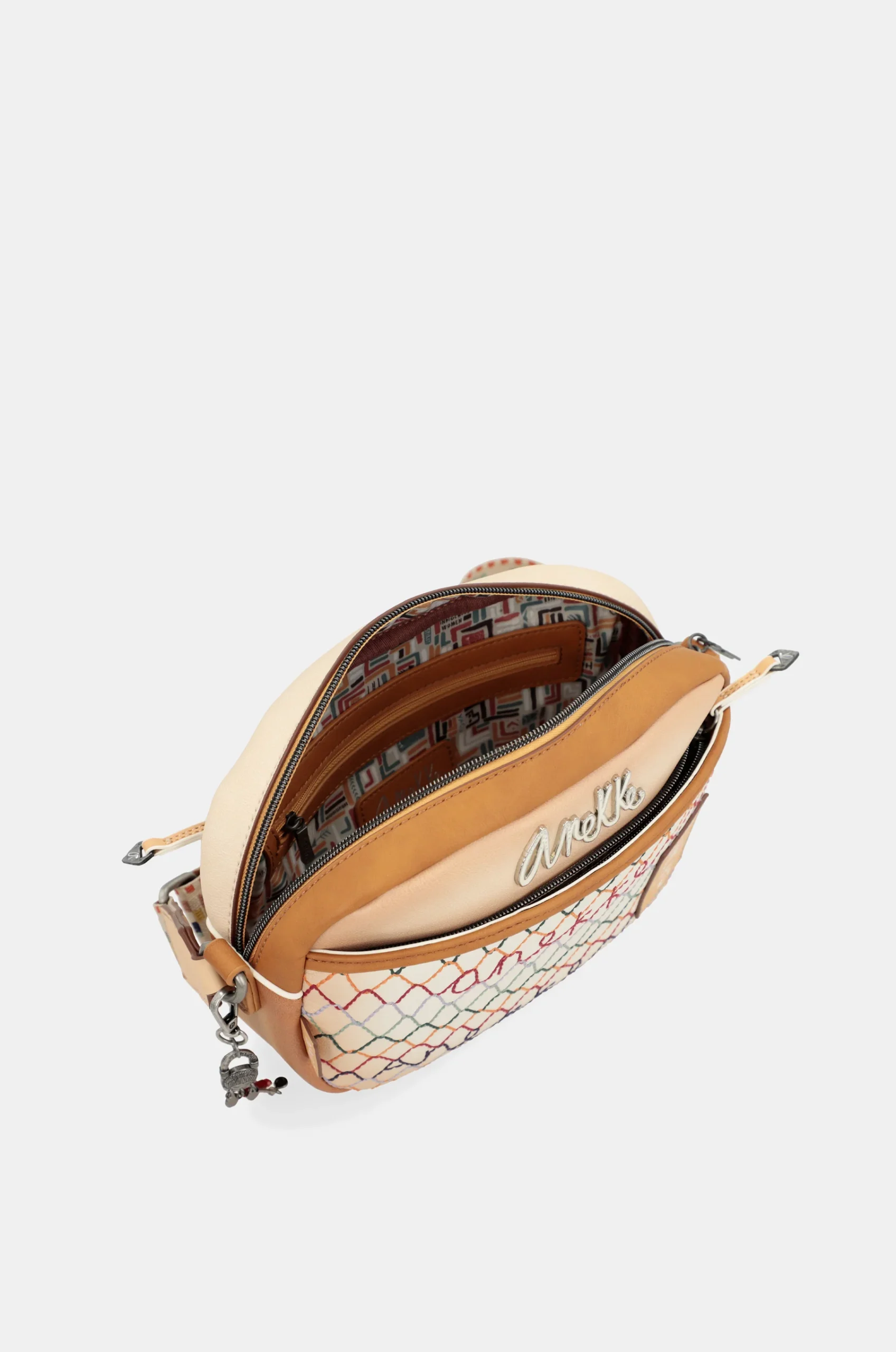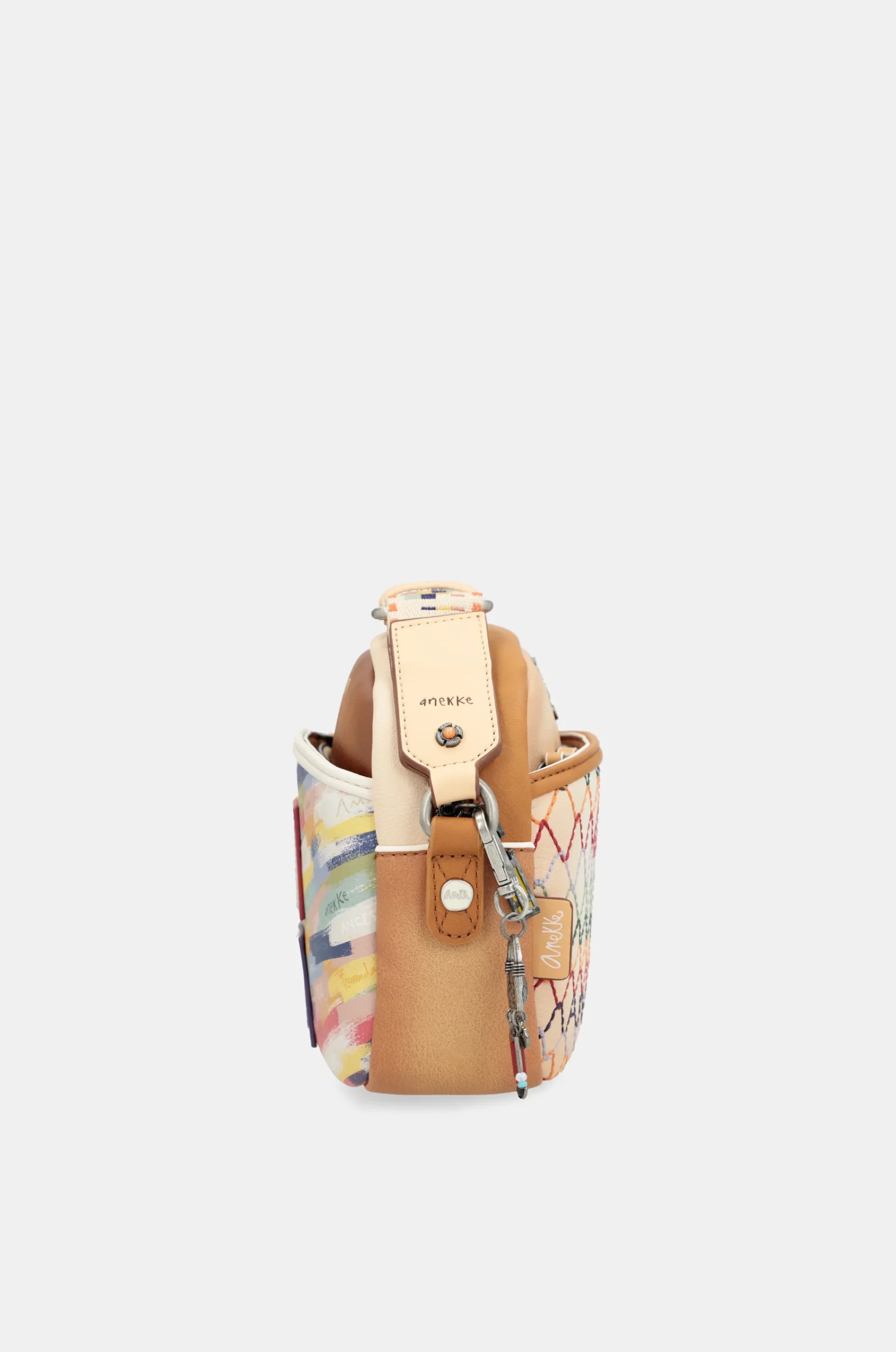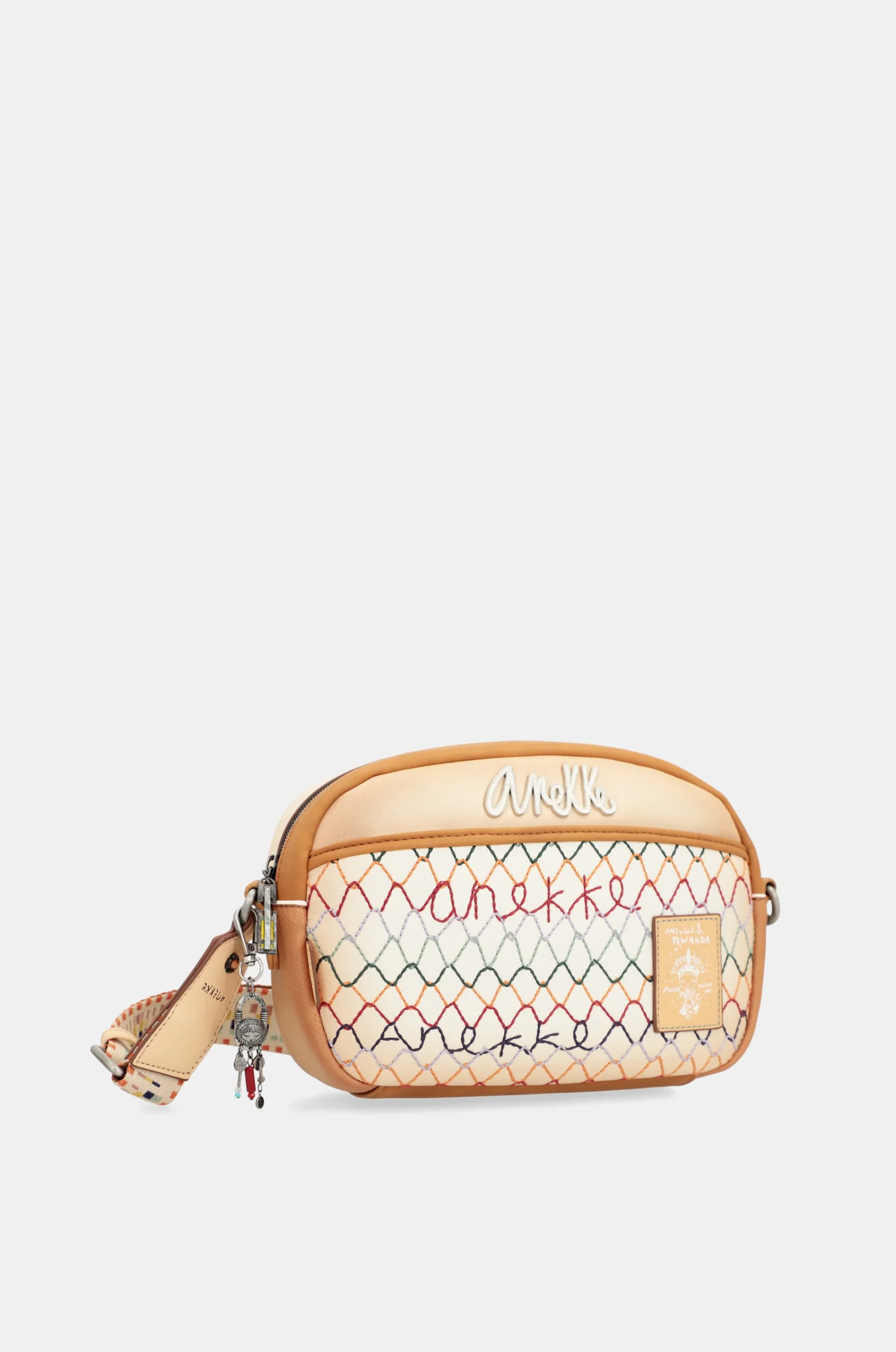Ce sac à bandoulière est de taille moyenne et a des poches avant et arrière. Ce sac est caractérisé car il combine une base de ton blanc cassé, qui recrée la forme d’un filet en différentes couleurs. Cela contraste avec des pièces en brun et beaucoup de détails. L’arrière a une impression colorée de coups de pinceau, dans laquelle certains mots peuvent être lus.