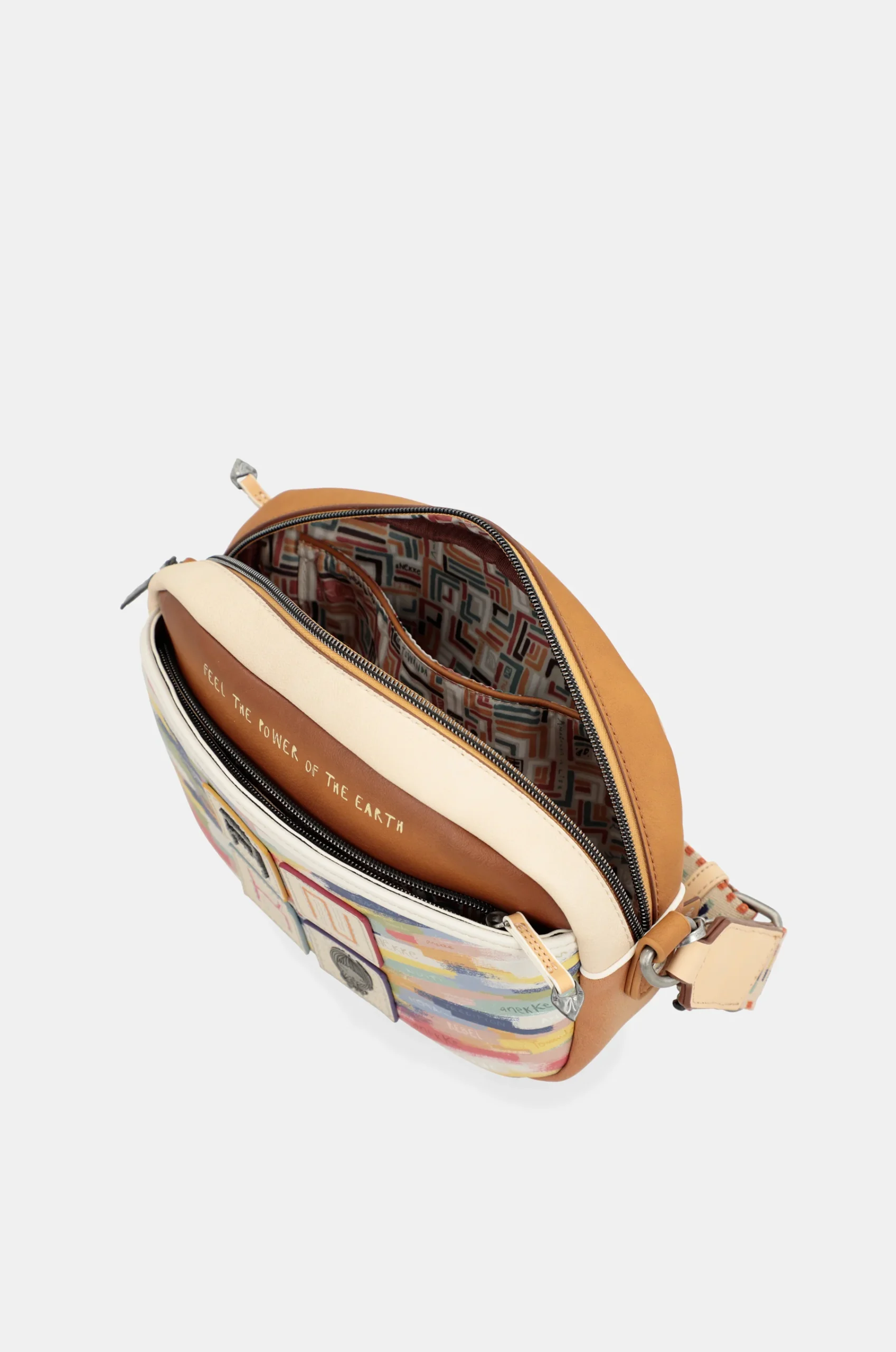 La poignée est un bandoulière réglable à différentes longueurs, parfait pour l’adapter à la hauteur que vous préférez. Il s’agit d’un large bandoulière avec un design unique, avec des motifs brodés en plusieurs couleurs. L’intérieur est bordé d’un tissu d’origine imprimé avec des motifs de la collection, et a des poches.