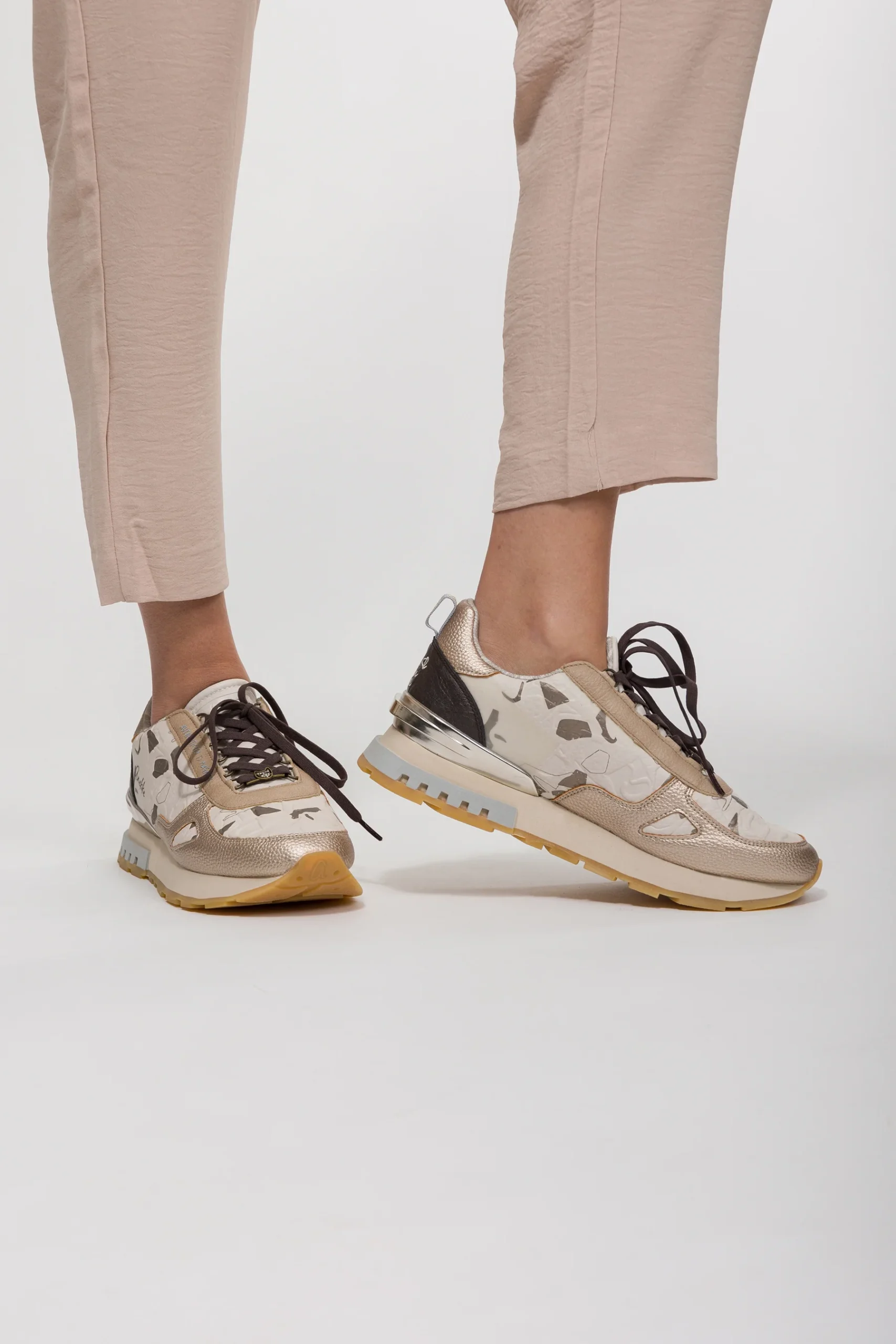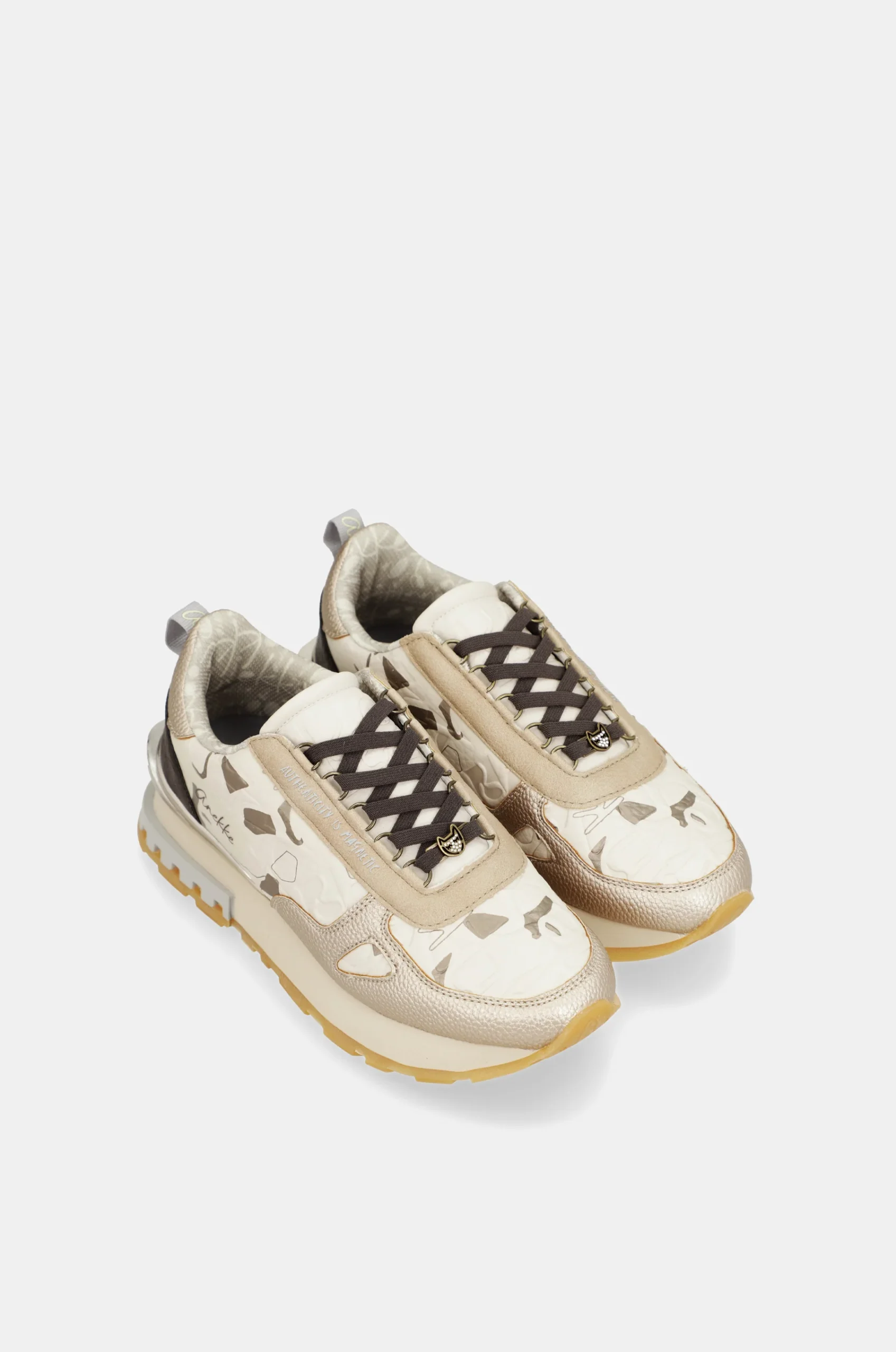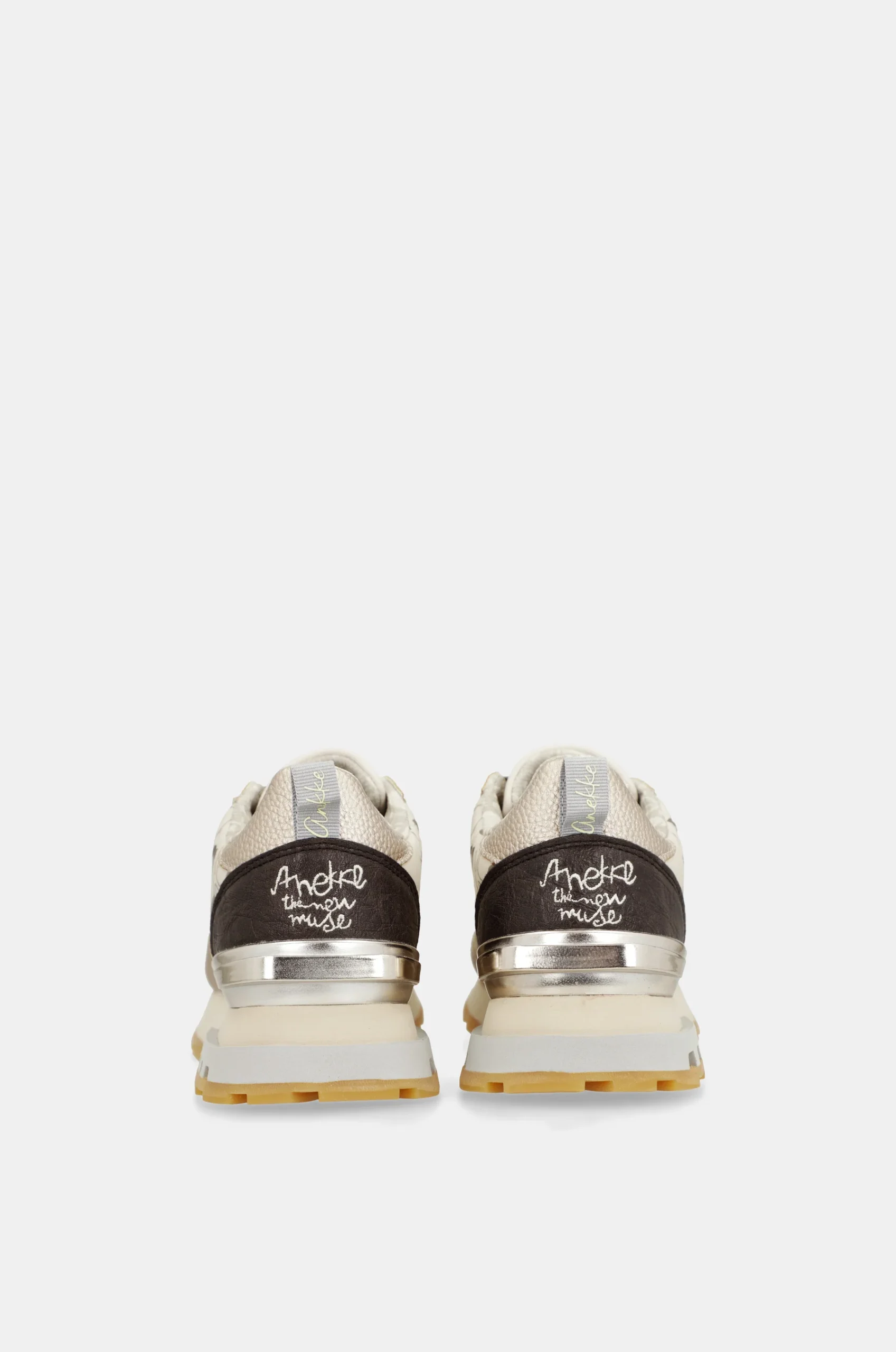 Ces baskets dorées et beiges, rehaussées de détails gris foncé, allient élégance et confort à chaque pas. La semelle crantée apporte une touche de modernité et de confort, tandis que les accessoires inspirés de la collection font de ce modèle une pièce unique, empreinte du charme et de la magie inimitables d’Anekke.