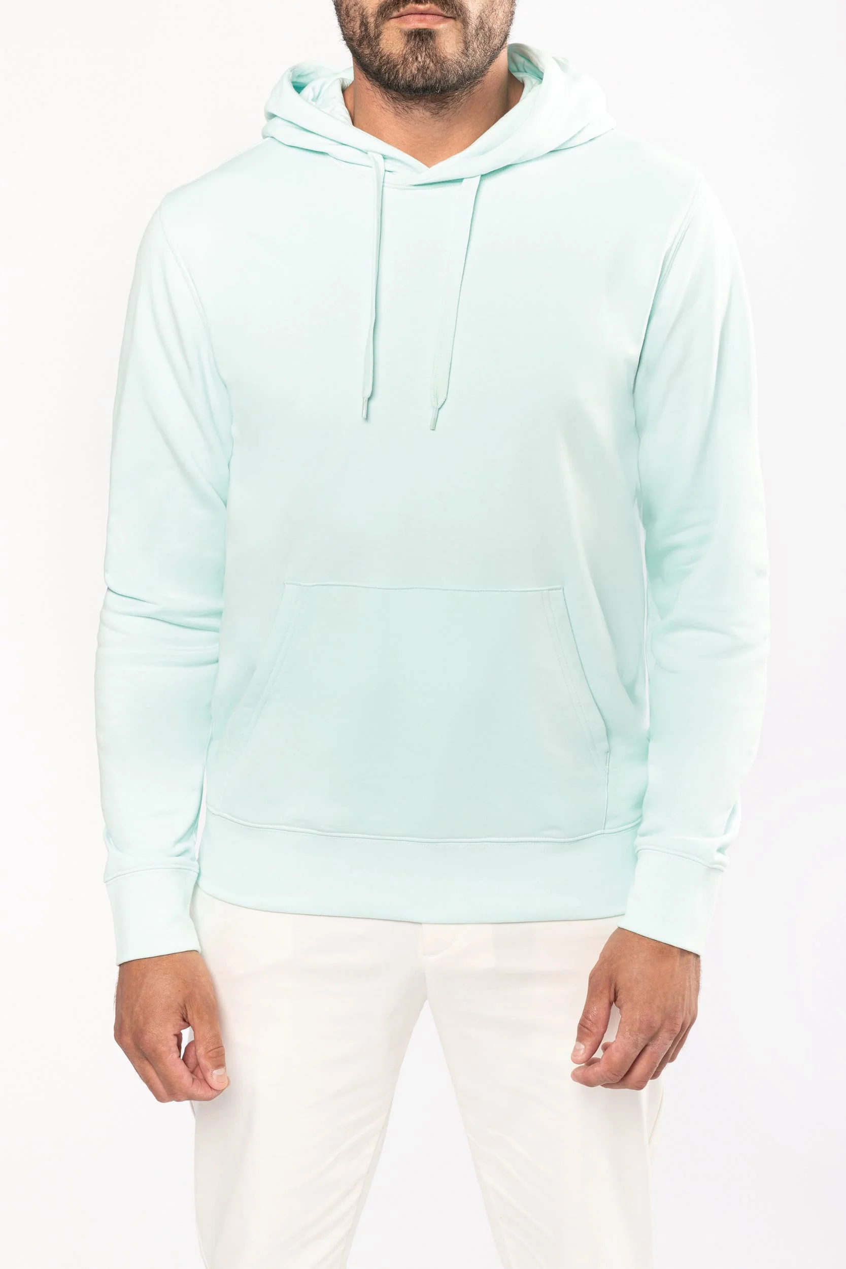 85% coton biologique / 15% polyester recyclé post-consommation. Surface extérieure 100% coton peigné . Molleton gratté 3 fils LSF (Low Shrinkage Fleece). Lavage aux enzymes. Coupe droite. Bord-côte 1×1 montage tubulaire pour une meilleure finition au bas de manches et de vêtement. Poche kangourou. Capuche doublée 100% coton, jersey de coton 180g. Bande de propreté jersey ton sur ton et finition demi-lune intérieur col. Finition double aiguilles sur bas de manches, bas de vêtement et col.
