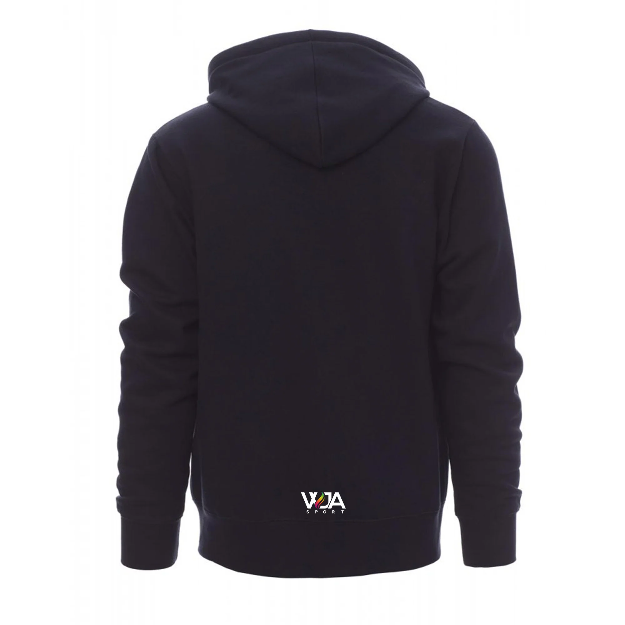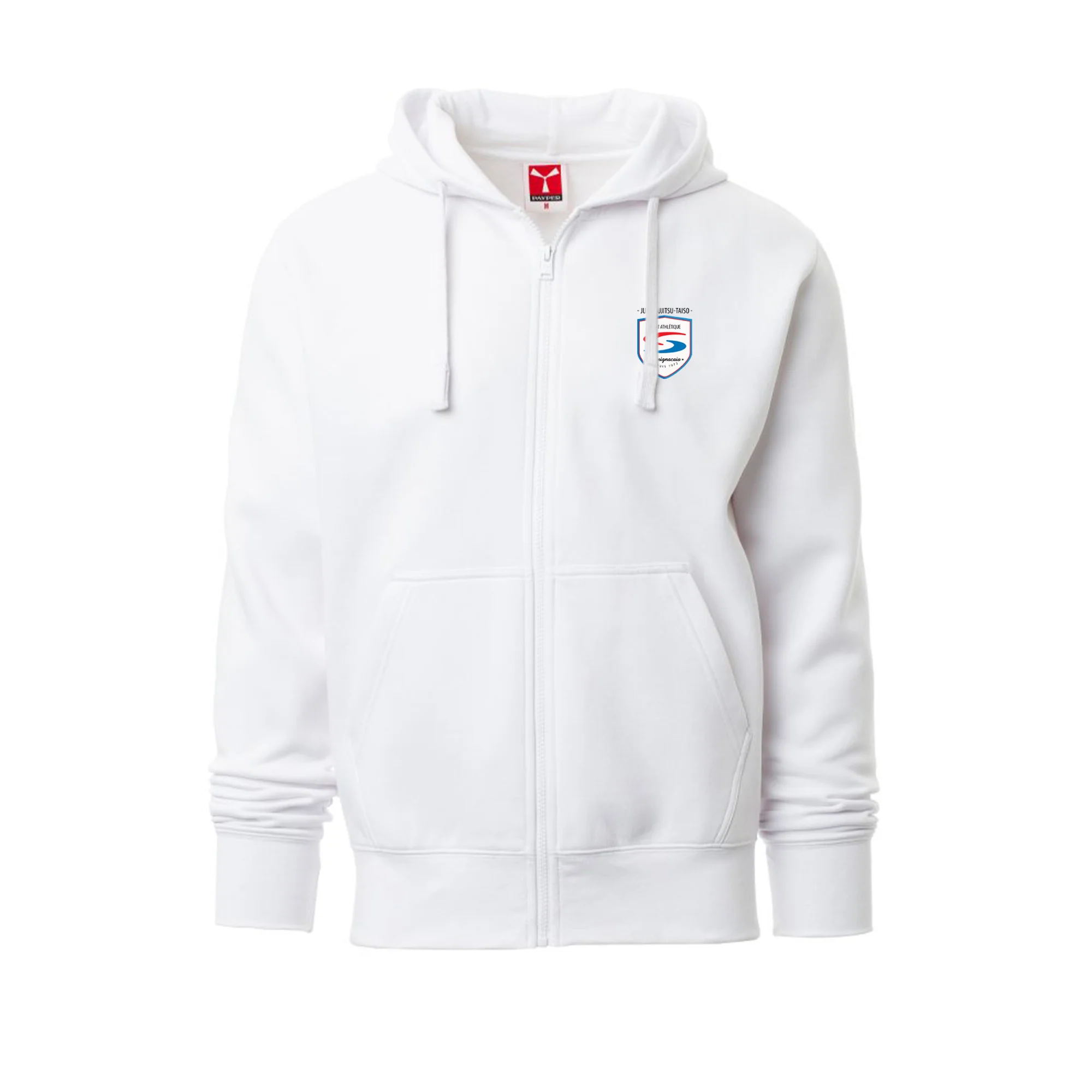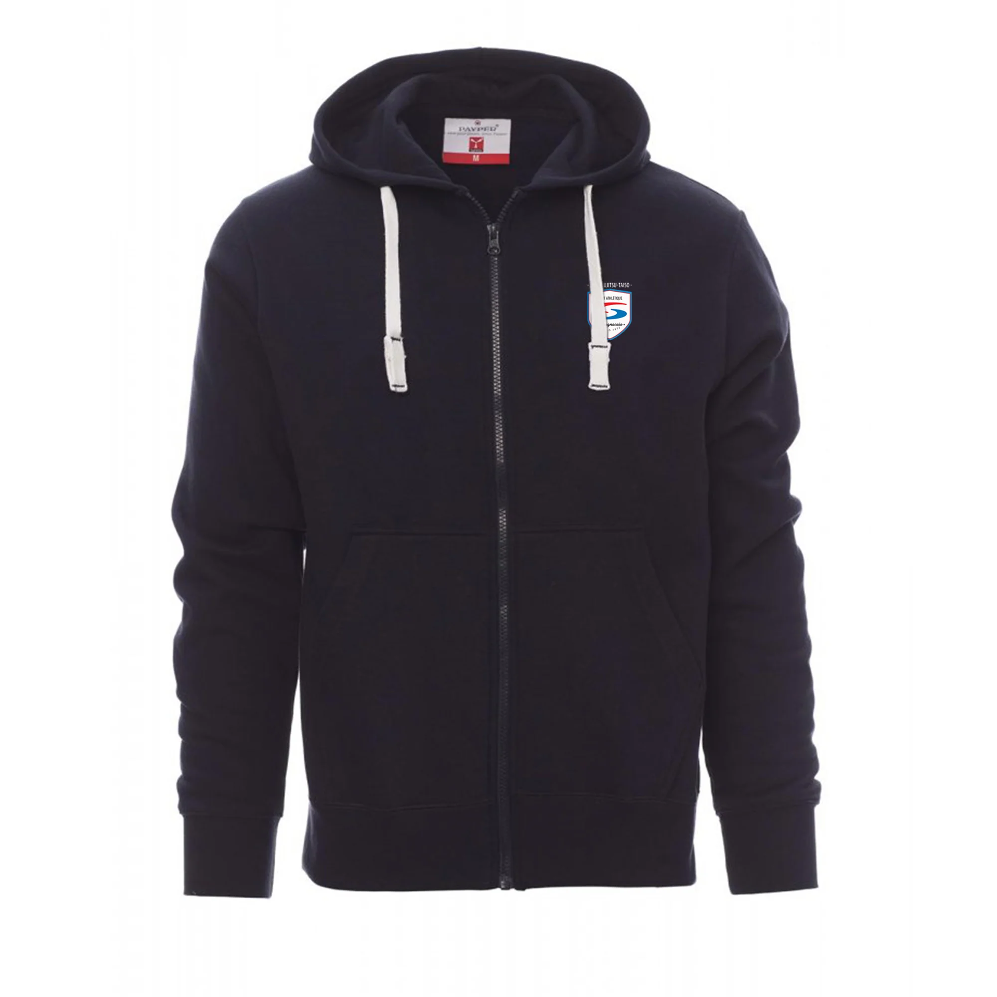 Veste Full Zip Unisexe. 280gr/m² 70 % Coton / 30 % Polyester. Sweat-shirt unisexe, à fermeture éclair intégrale à un seul curseur en métal, capuche, coulisse en corde avec coutures assorties au sweat-shirt, manches montées, poches kangourou, poignets et taille à côtes élastifiées.